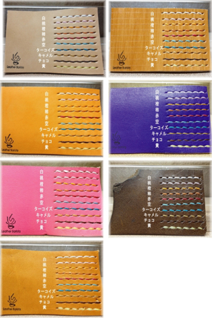 ステッチは各皮革共通で「白、桃、橙、柿、赤、空、ターコイズ、キャメル、チョコ、黄」