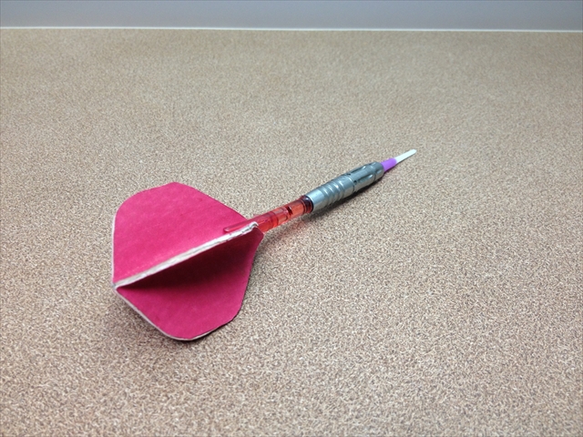 革のフライト ダーツケース/グッズ 2012.12.23 あるお客様から、レザーでダーツのフライトが作れないとご質問を頂きました。 一番薄い革で製作したものがこちらです。 革の厚みではシャフトに差すことができず、それでも強引につけてみました。 そして実際に投げてみると。。。 やはり重くてちゃんと飛ばせることができませんでした>< 飾りとして、コンセプトモデルとして、お店に飾ろうかと思います。