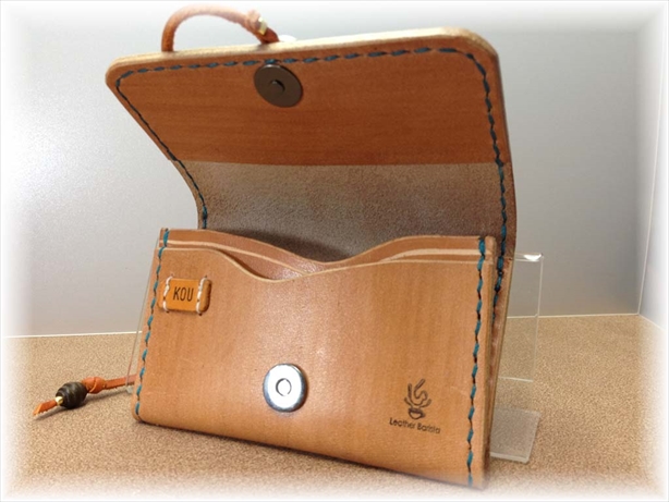 名刺ケース 柿渋染め 創作革小物/スマホケース 2012.12.28 今回お客様にオーダー頂いたのは。レザーバリスタ定番の名刺ケースを、より男っぽくと仕上げました。 コンチョを付け、ひもでケース自体をぐるぐる縛って止める仕様です! そしてそして、柿渋染めレザーをチョイスすることでぐぐぐっと引き締まりますね^^ ヒモだけではなくマグネットボタンも付いておりますので、万が一の時に開くことも防止できますよ^^