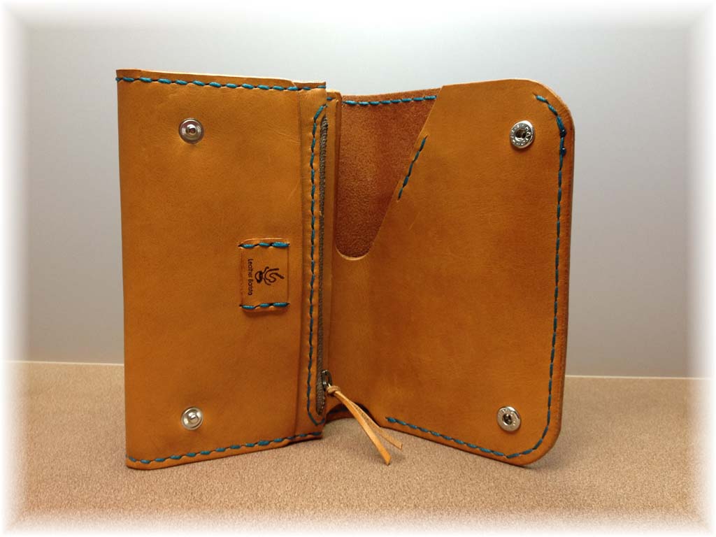 旦那様は、キャメルにターコイズステッチの二つ折りロングウォレットです!