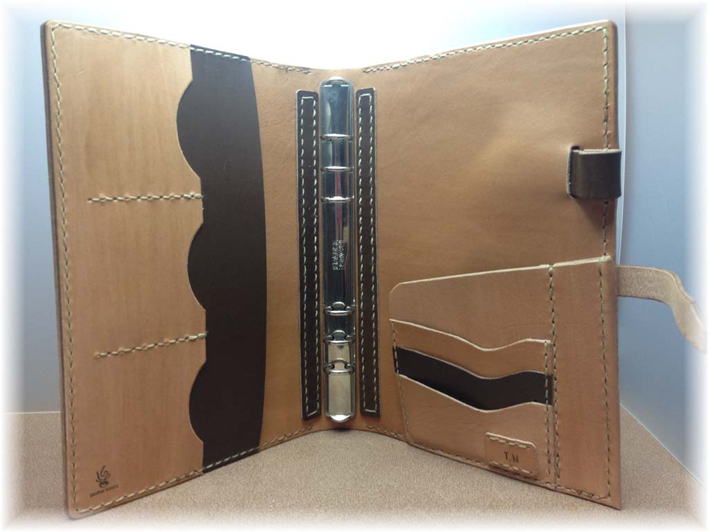 システム手帳 A5サイズ ステイショナリー/手帳 2013.01.07 去年の最後のオーダーを頂きましたのは、柿渋染めレザーを使用したシステム手帳です。 ポイントにチョコの革を使用しまして、柿渋との相性もばっちりだと思います^^ バインダー部分には老舗クラウゼ社をチョイスしております。 ペンホルダー部分は可変式ですので、ペンのサイズをといません。 やはり納品した時のお客様の嬉しそうな顔みるのは、革職人として一番充実した瞬間です。 オーダー本当にありがとうございました!!