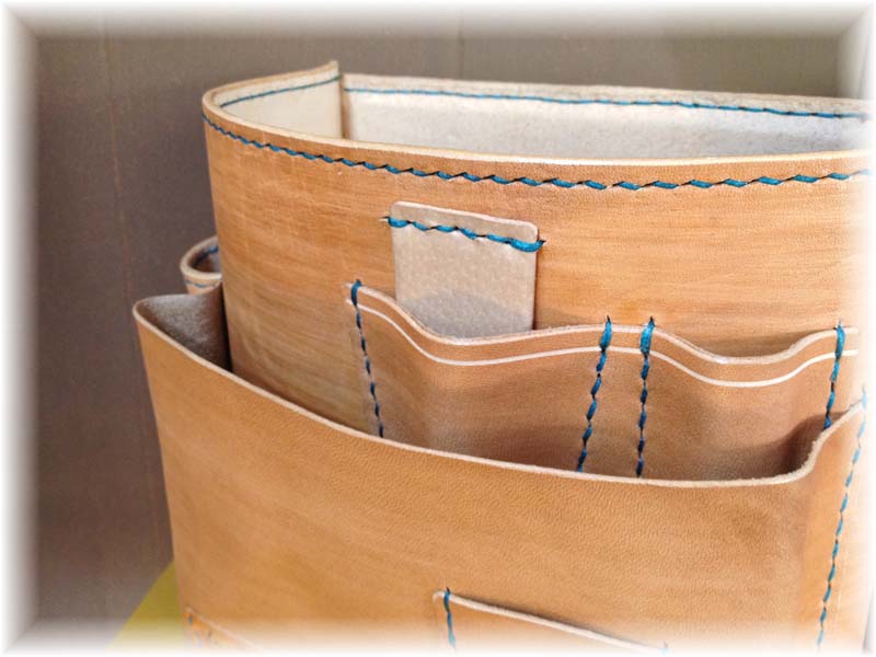 カッターナイフポケットには、アルミ板を包み込んだ革で前胴が切れないようにガードしました。