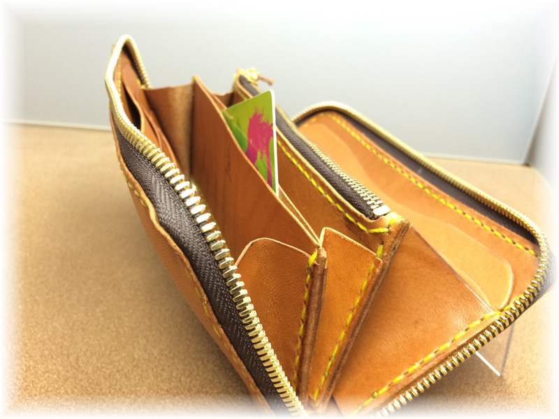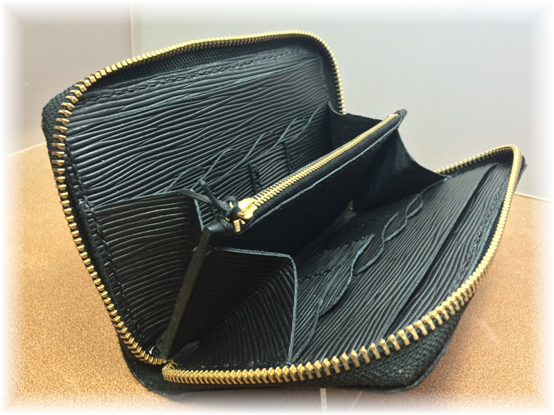 まずは、某有名ブランドでも有名なウェーブ模様の型押しレザーを使った、カード縦入れのお財布です。