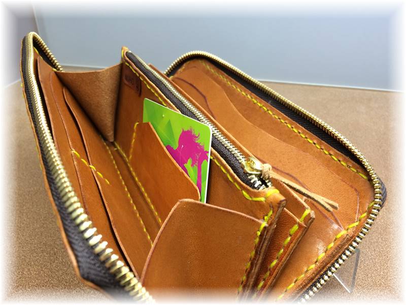小銭入れ側面には、よく使うカードを挟めるポケット、札入れは3つにし、その間にもフリーポケットを付けました。