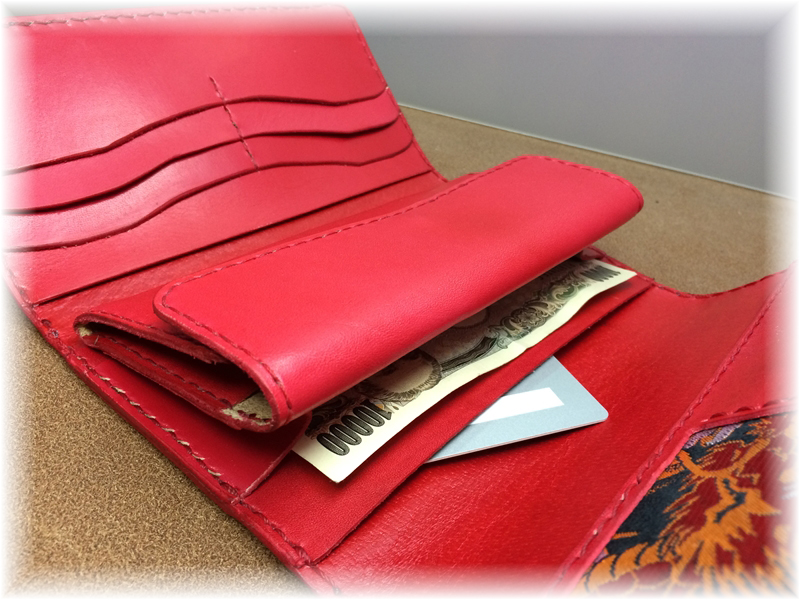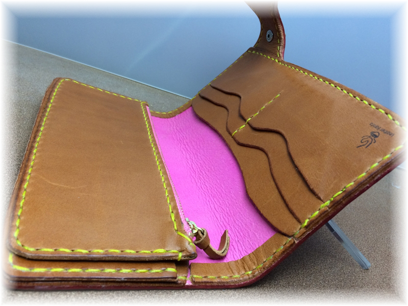 裏地はピンクのピッグスキンを貼り合わせ、開けた時のインパクトはとても大きいです!