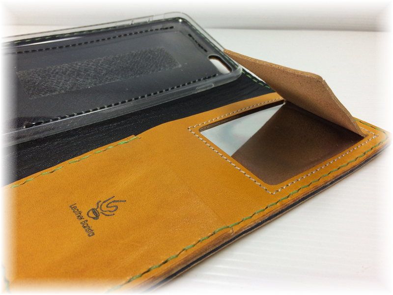 樹脂のケース部分にも薄いレザーを貼り合わせて高級感を出しております。