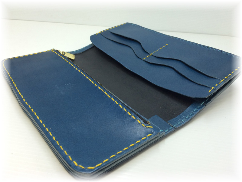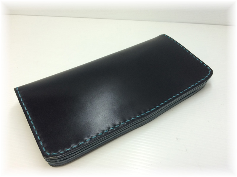 ロングウォレット スマート コードバンのご紹介です。 お財布 2015.05.17 シンプルなデザインですが、機能面はぎりぎりまで容量が入る様に設計しております。 お客様は外の皮革はコードバンを使用し、内部はネイビーブルーのレザーをお選び頂きました。 よく見るとサイドの部分はゆるやかにカーブを描いております。 ここが男女共にお選び頂ける理由ではないでしょうか? 札口にはマチが付いています。 写真では隠れてしまってますが、その下にぴったりとお札が収納できる札口があるのです。 二つの札口を使い分けられます。 オーダー頂きまして本当にありがとうございました。