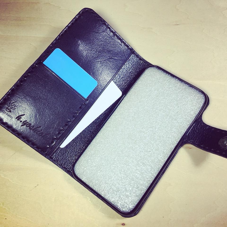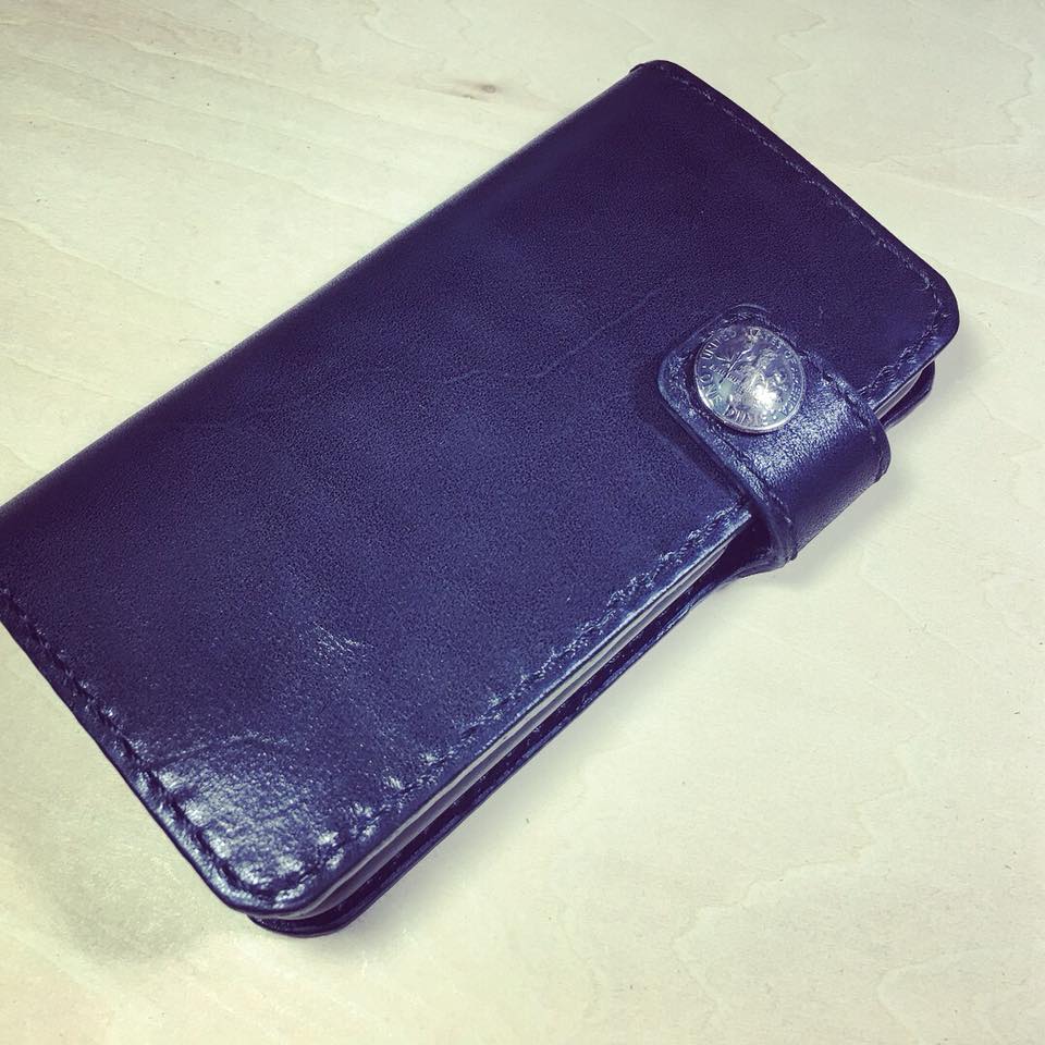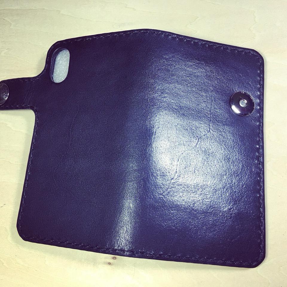 iPhoneX のレザーケース 創作革小物/スマホケース 2018.01.17 黒の栃木レザーを使用したiPhoneX のレザーケースです。表側はフラップ部分まで一枚の革を使用し、コンチョボタンをマグネットボタンに加工してアクセントにしております。