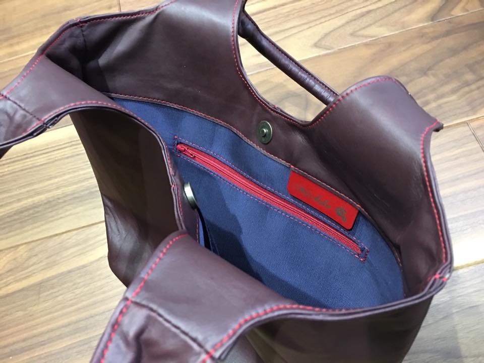 婦人向け ハンドバッグ バッグ/ワーク・シザー 2018.03.05 婦人向け ハンドバッグ ボルドー色の羊の革を使用しました。 全ての部分に同じレザーを使うことで一体感を出しております。 裏地には青を基本にし、赤を使ったワンポイントを施しております。 胴部分には縫い割をアクセントにしまして、持ち手も縫い割を使った一体型にしております。 ポケットの大きさ、位置、持ち手の長さなど細かい部分にもこだわったオーダーバッグです。