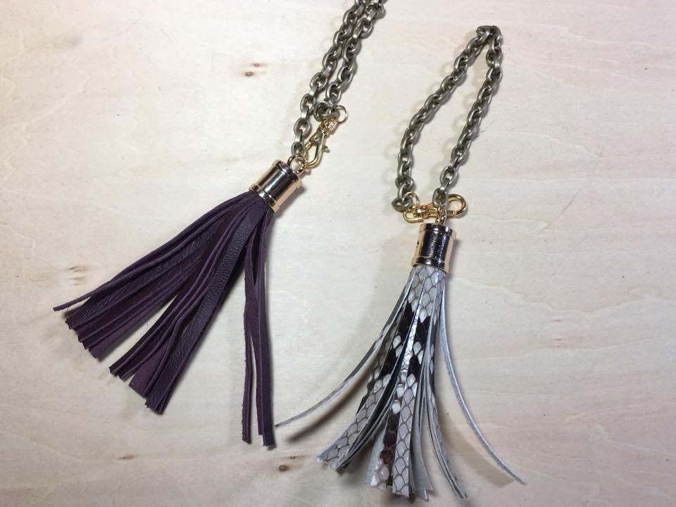 レザー製のタッセルです。 創作革小物/スマホケース 2018.04.08 レザー製のタッセルです。 金具にも丈夫で重厚感のあるもの、チェーンにはアルミ素材を使用してなるべく軽く仕上げております。 蛇革、トカゲ革、柔らかい羊革などなど、お好きなレザーをお選び頂けますのでお気軽にお問い合わせお待ちしております。