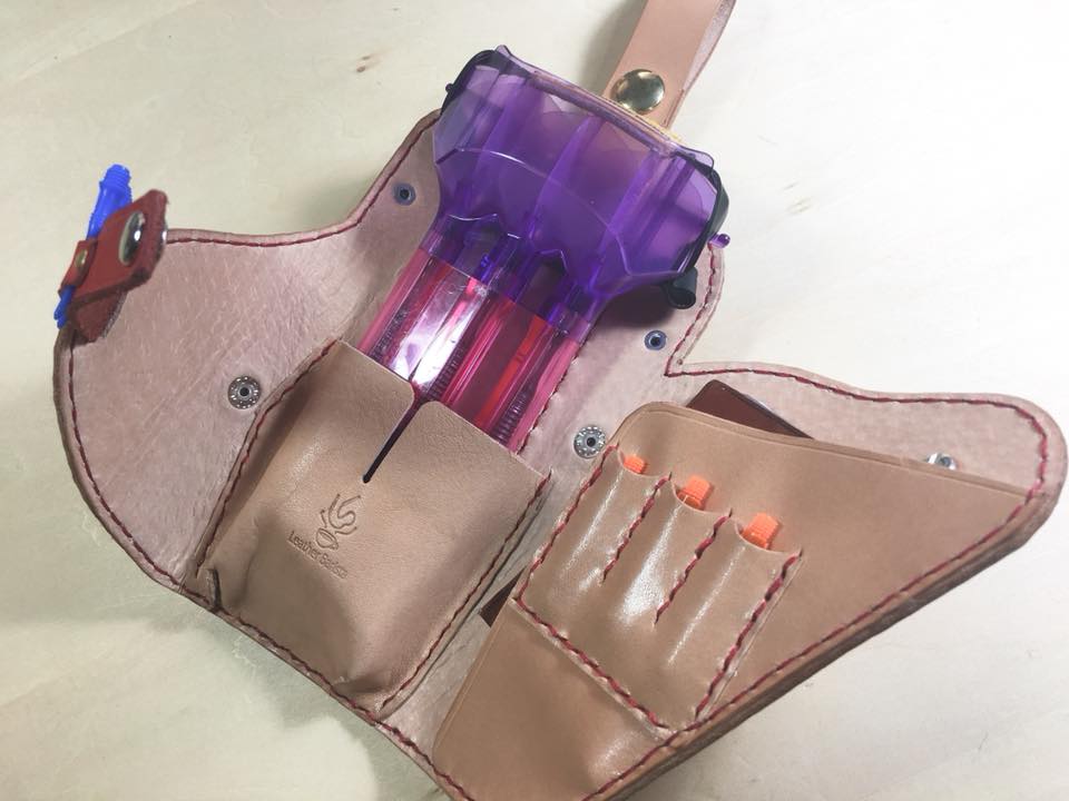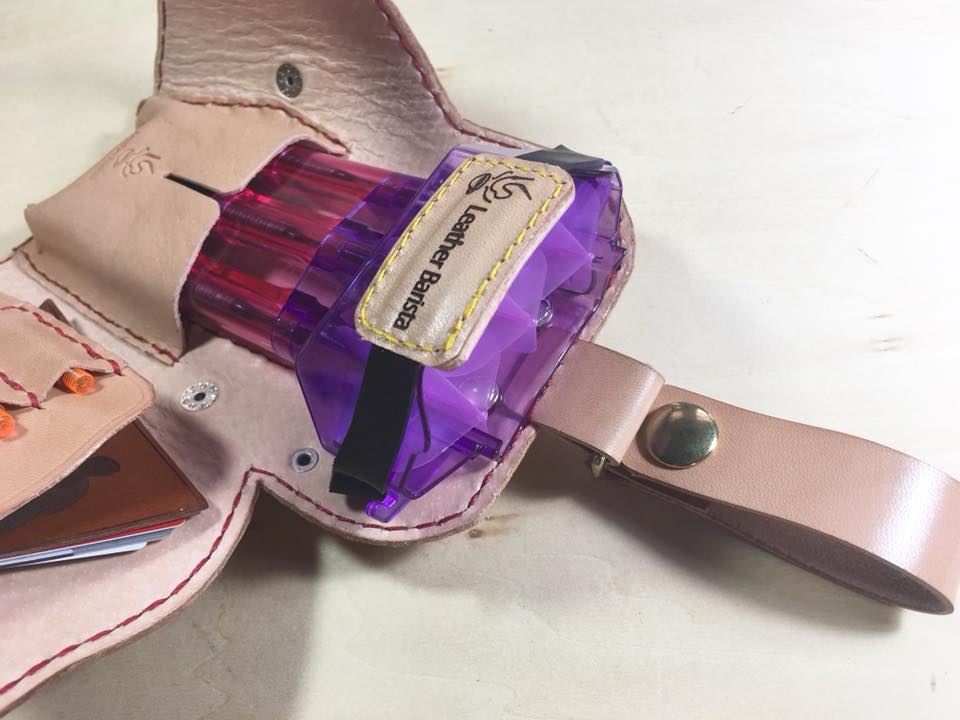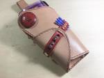 当店定番のダーツケースのカスタム例です。 ダーツケース/グッズ 2018.08.12 当店定番のダーツケースのカスタム例です。 通常はコインを加工して作るコンチョをレザーで作りました。 これならお好きなイラストをコンチョに仕上げる事ができます。 ベルト部分にはキラキラアクセントを! フライトケースのゴムベルトもオリジナルで作りました。 これでダーツのモチベーションあげて日々練習しようかな。。 裁断、手縫い、型紙デザインまで全ての工程をハンドメイドで製作しております。 ミシンを使わない手縫い縫製なのでとても丈夫で長い間お使い頂けます。