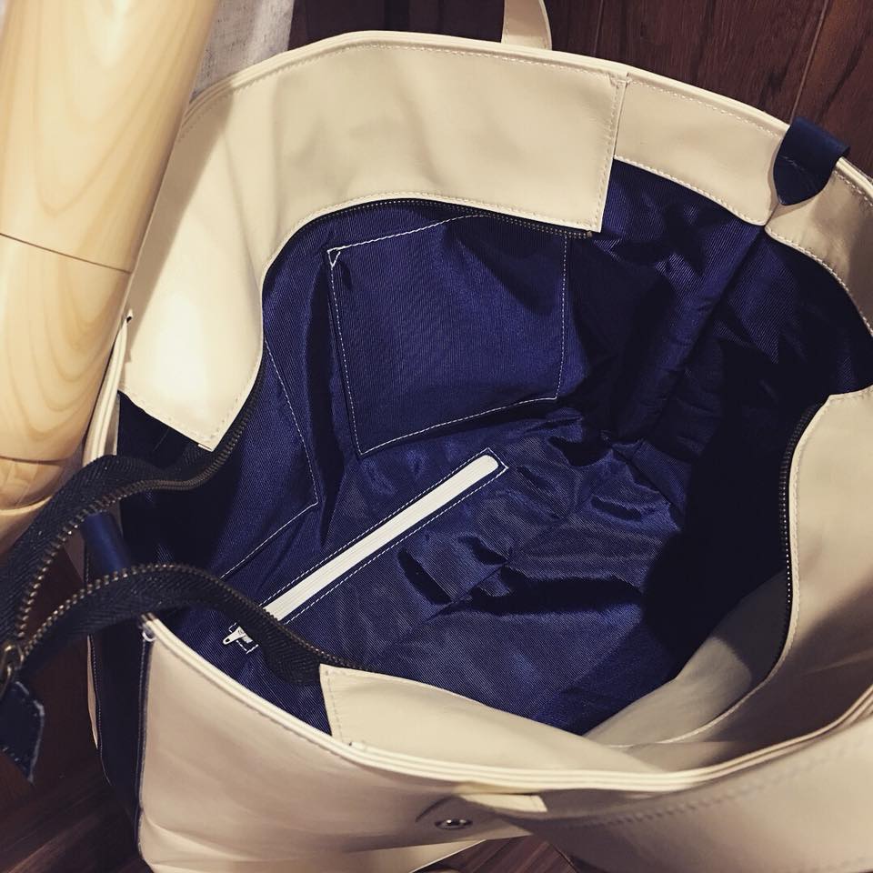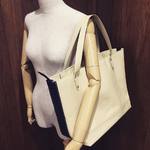 牛革ホワイトレザーを使ったトートバッグです。 バッグ/ワーク・シザー 2018.08.18 牛革ホワイトレザーを使ったトートバッグです。 サイドにはネイビーのヌメ革でワンポイントをあしらいました。 内装もネイビーにて統一し、底に隠しポケットをつけました。 こちら全てミシン縫製です。