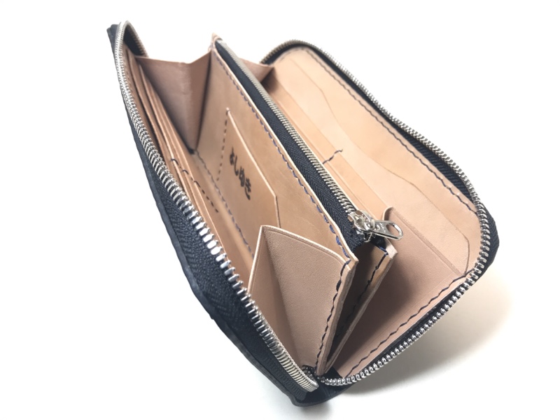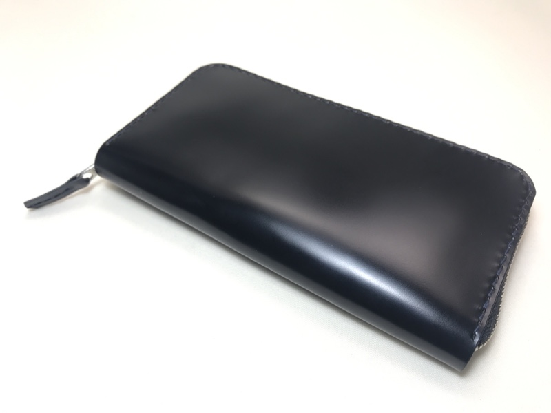 コードバンシリーズです お財布 2019.12.08 ラウンドファスナーのお財布をコードバンで合わせるのはとても素敵です。 ものすごい艶で光っておりまして、2次元なのに奥が透けて見えそうな光沢です。 ファスナーも最高級の物を使いさらにアップグレードしました。 内装は牛の革を使っておりますが、こちらもヌメ革というとても高級なレザーを合わせました。