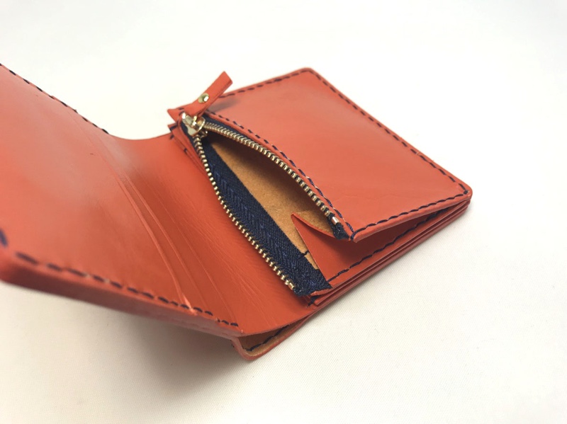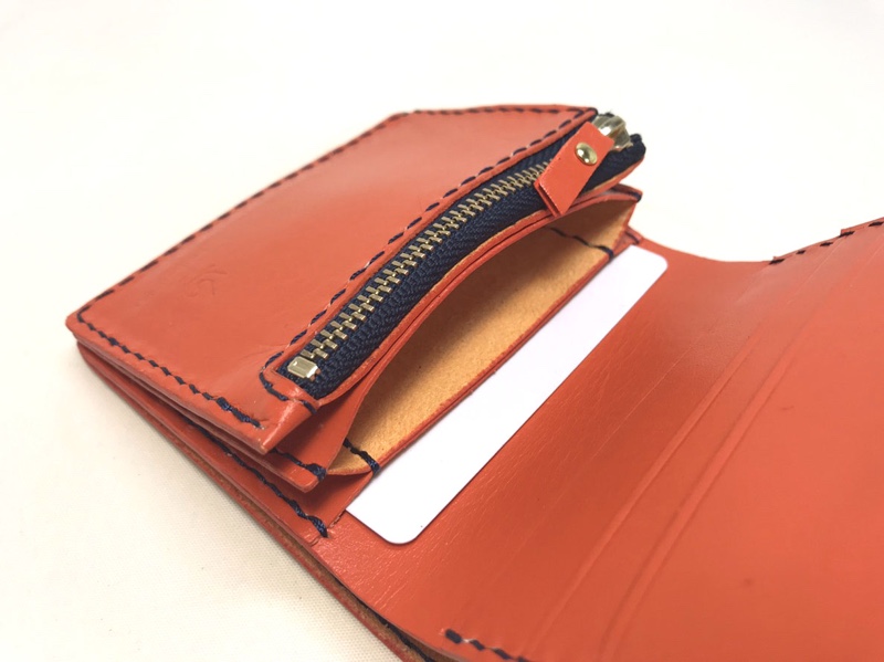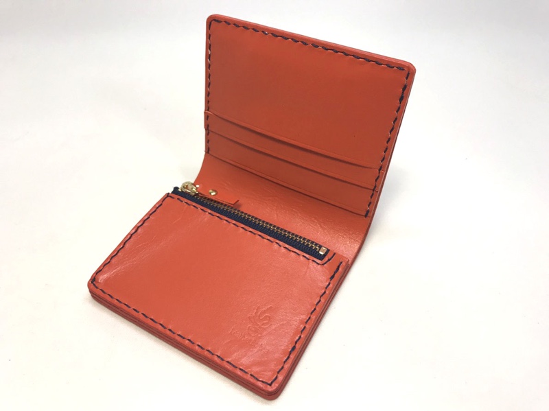 オレンジレザーのお財布 お財布 2019.12.23 オレンジ色のレザーを使った二つ折り財布です。 小銭入れも平ポケットの片側マチというコンパクト設計。 カードポケットもフリースペースも最小限に抑えてとてもコンパクトに使いやすく仕上げました。