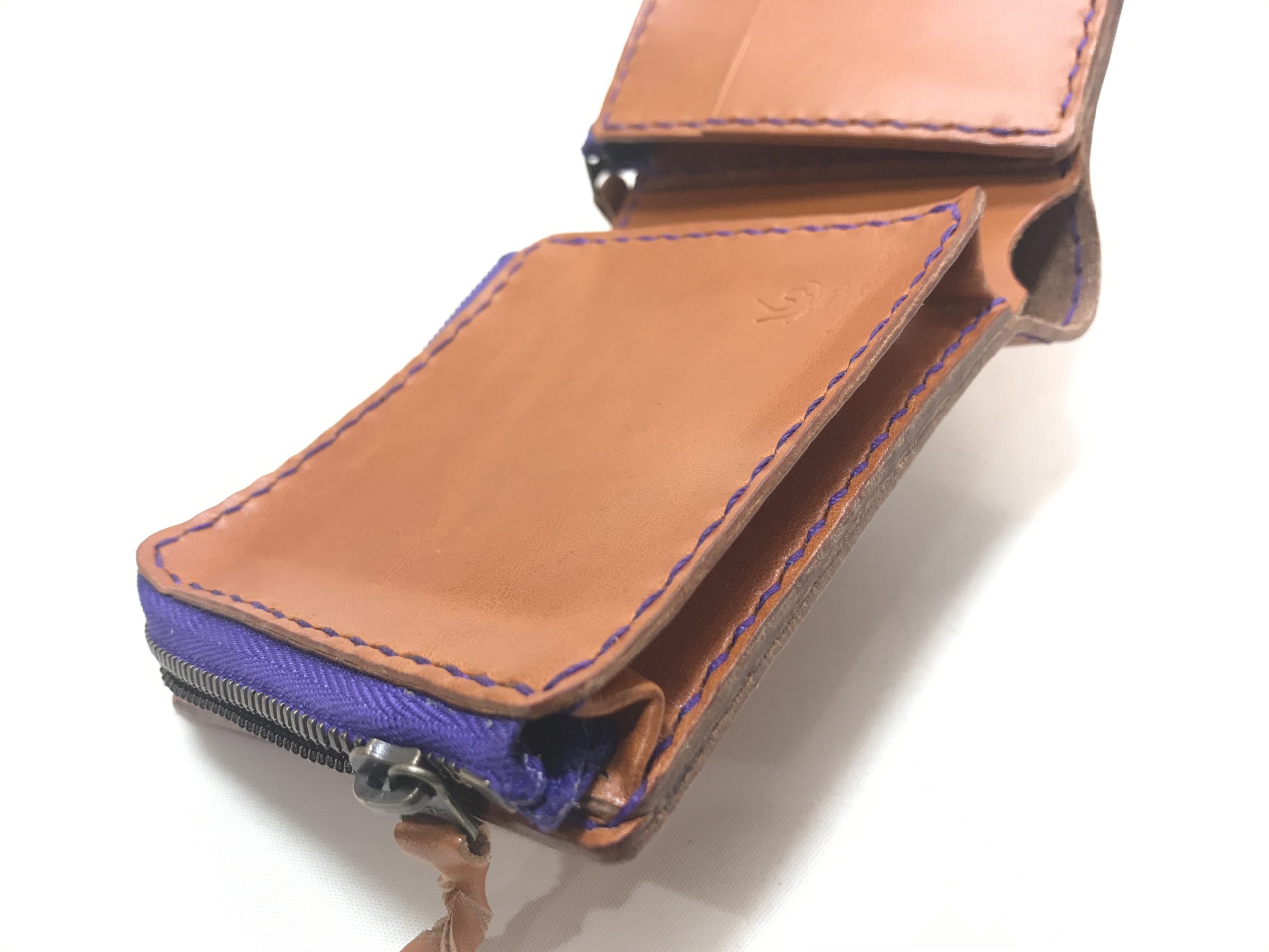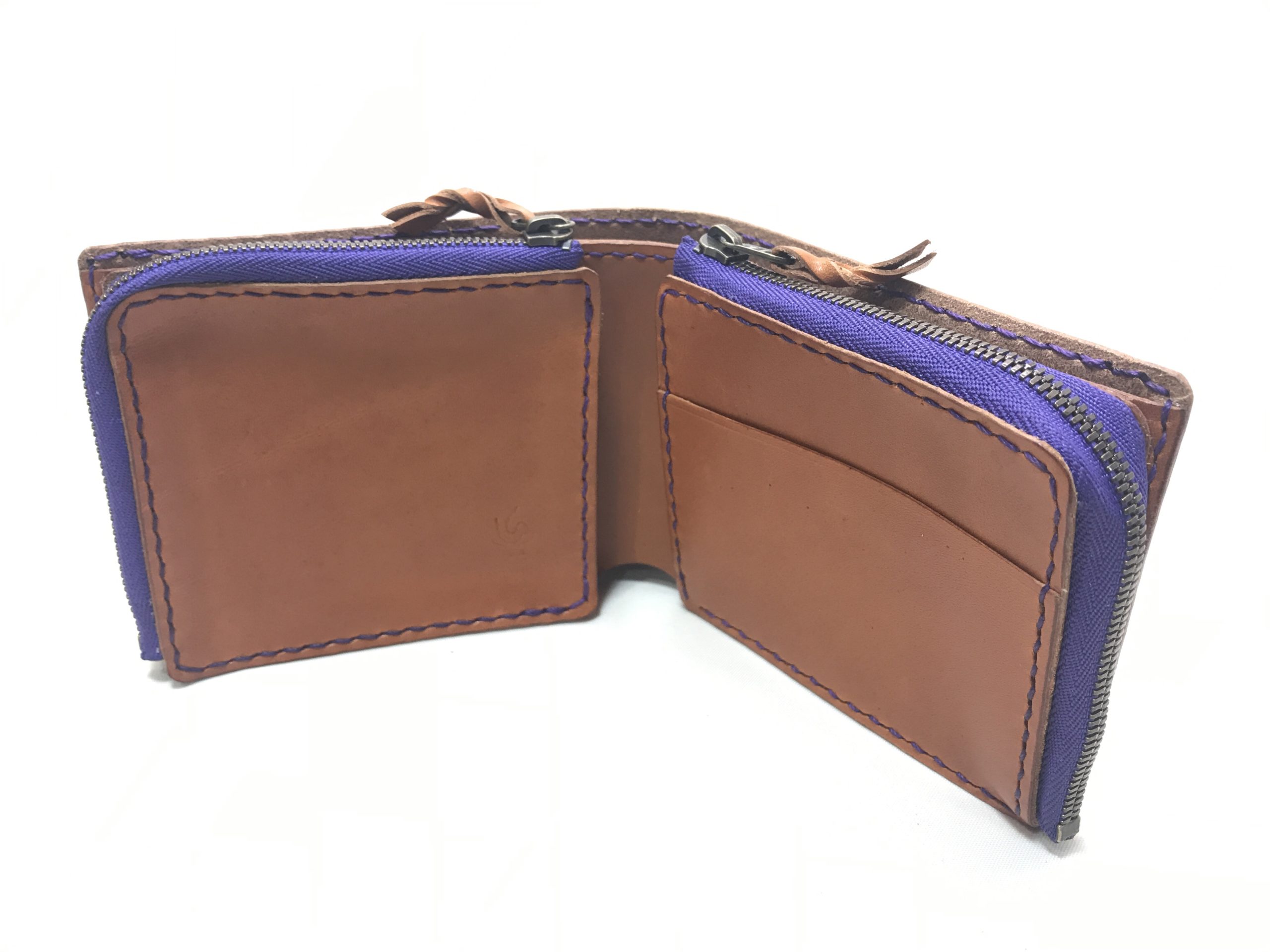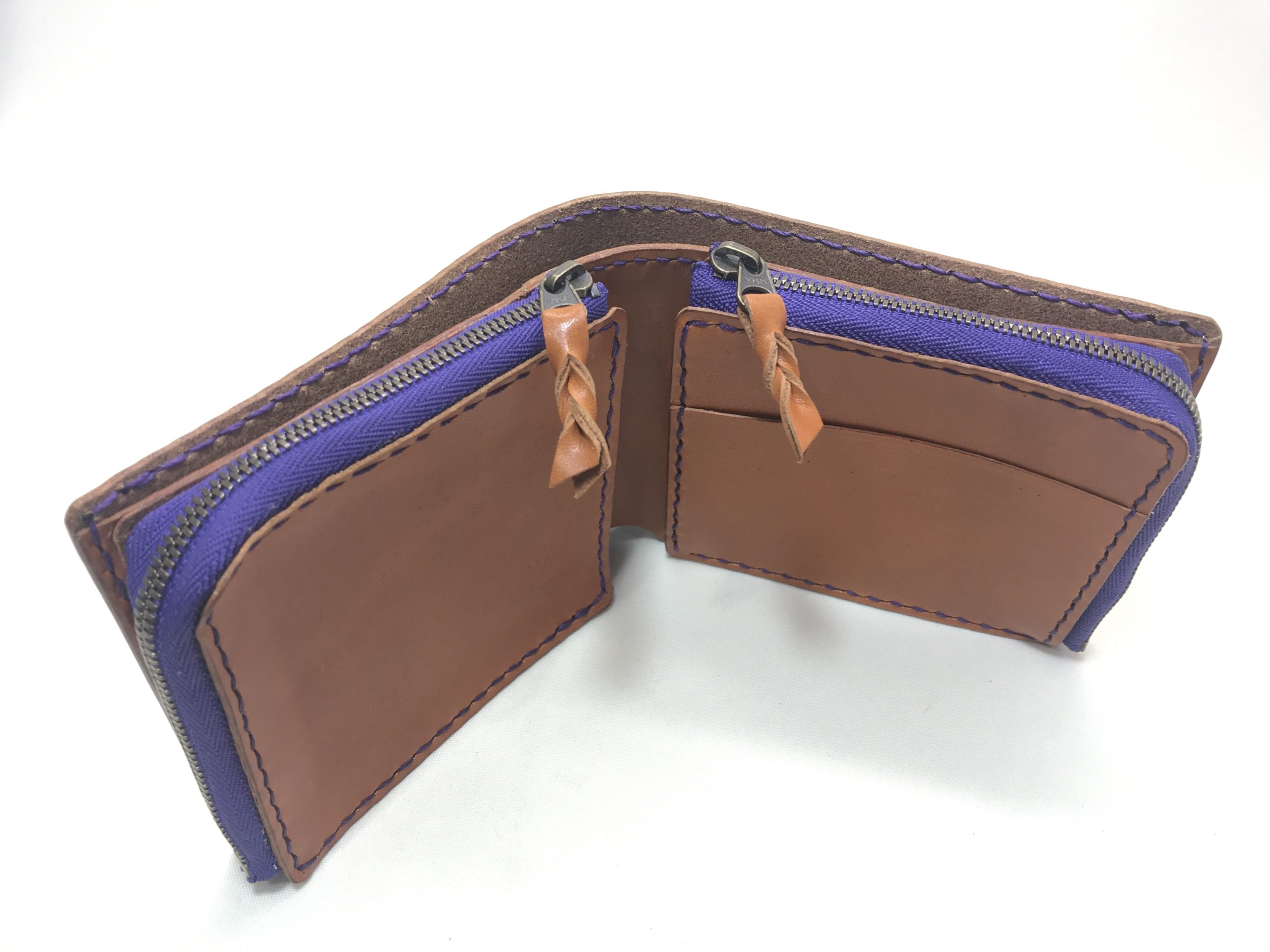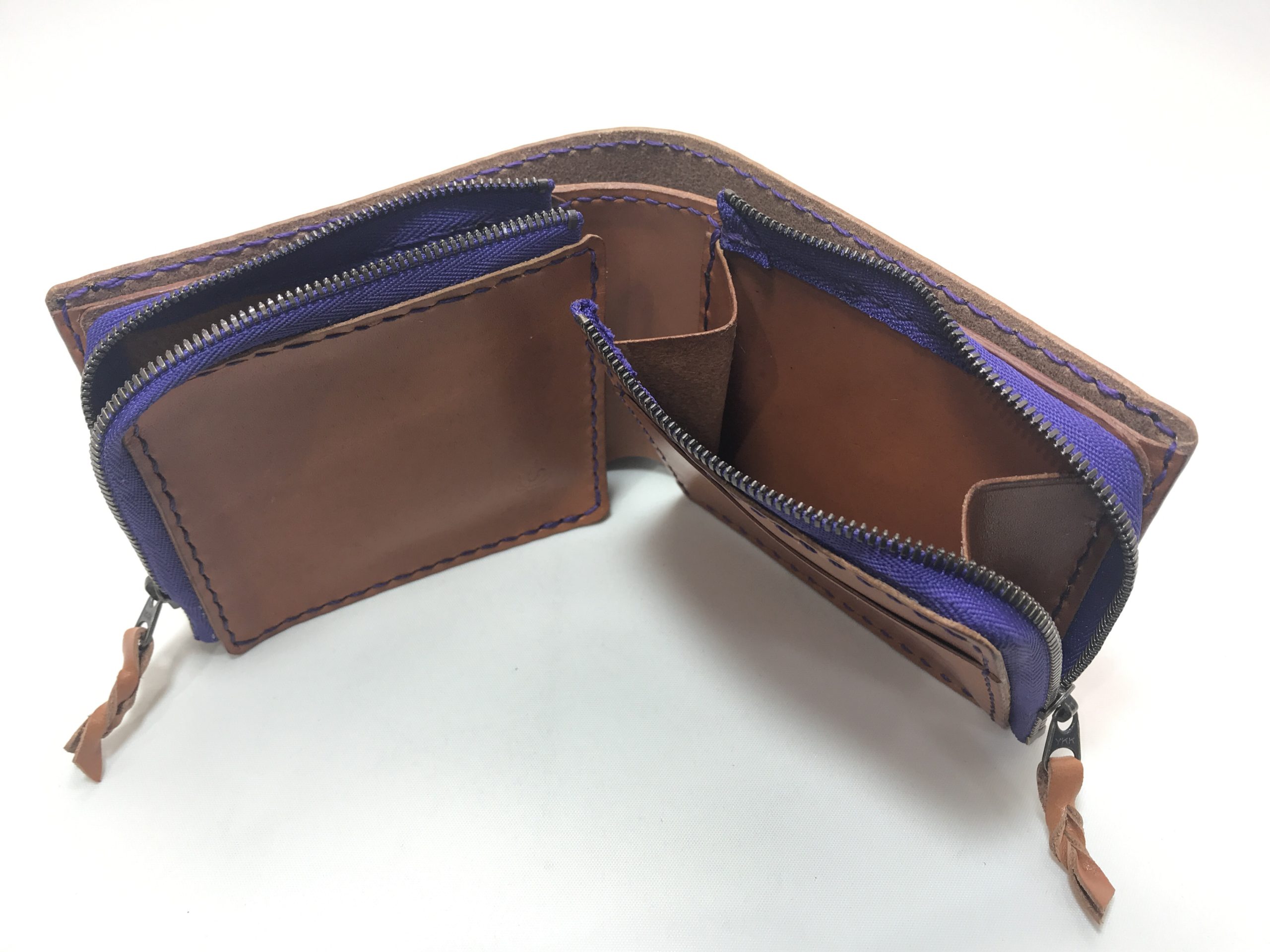 ダブルファスナーポケット搭載 お財布 2020.05.21 フルオーダーメイドの二つ折り財布です。ダブルファスナーポケットを搭載して、ふんだんに余力スペースを活用しました。 お客様のご要望をヒアリングし、ラフを作り、そこから設計図、型紙と作っていきます。イメージの写真を作りお客様とメールにて何回かやりとりしてから製作します。 一年経ちましたが先日とても使いやすいとお褒めの言葉も頂きました。ありがとうございます!