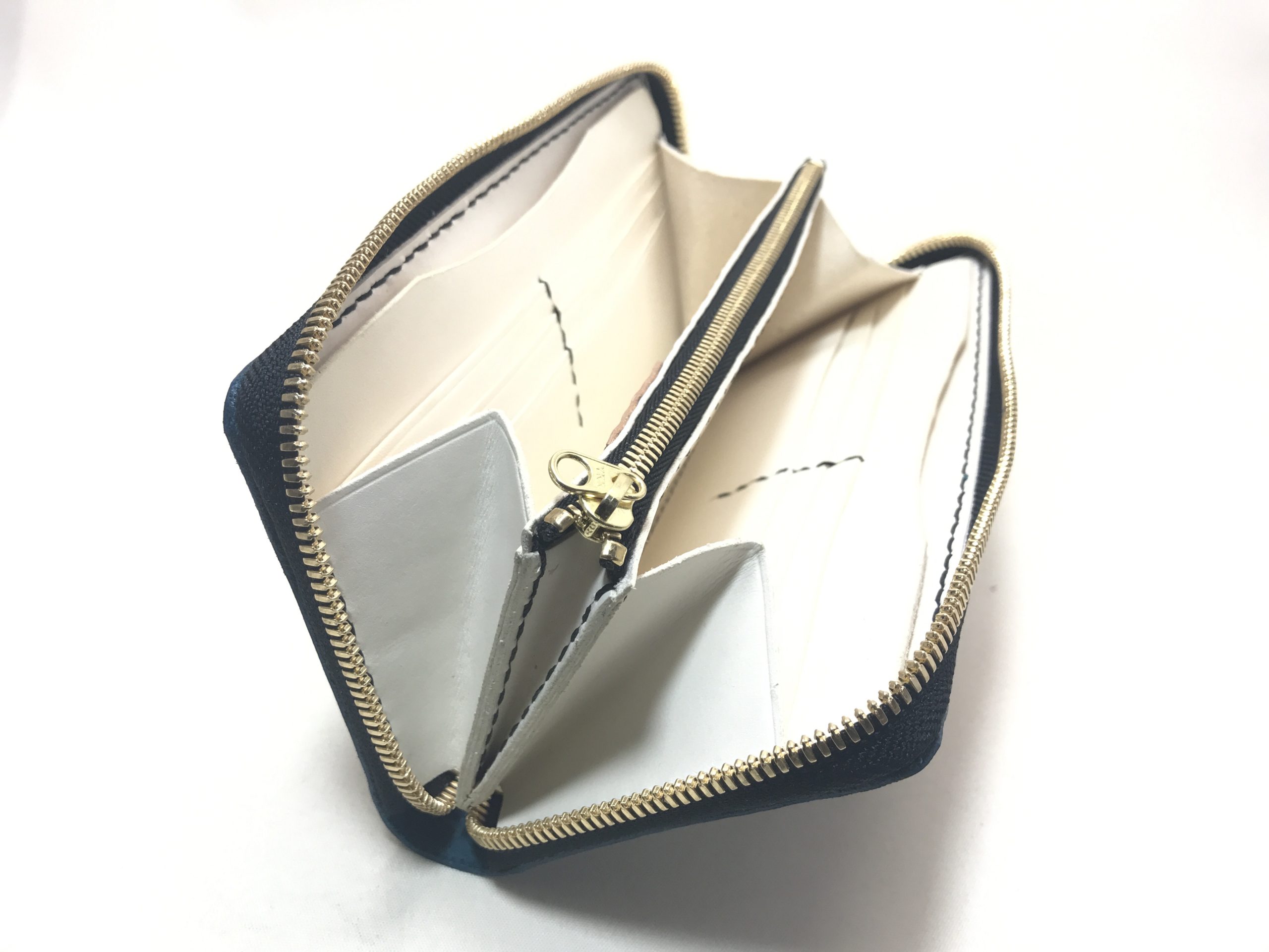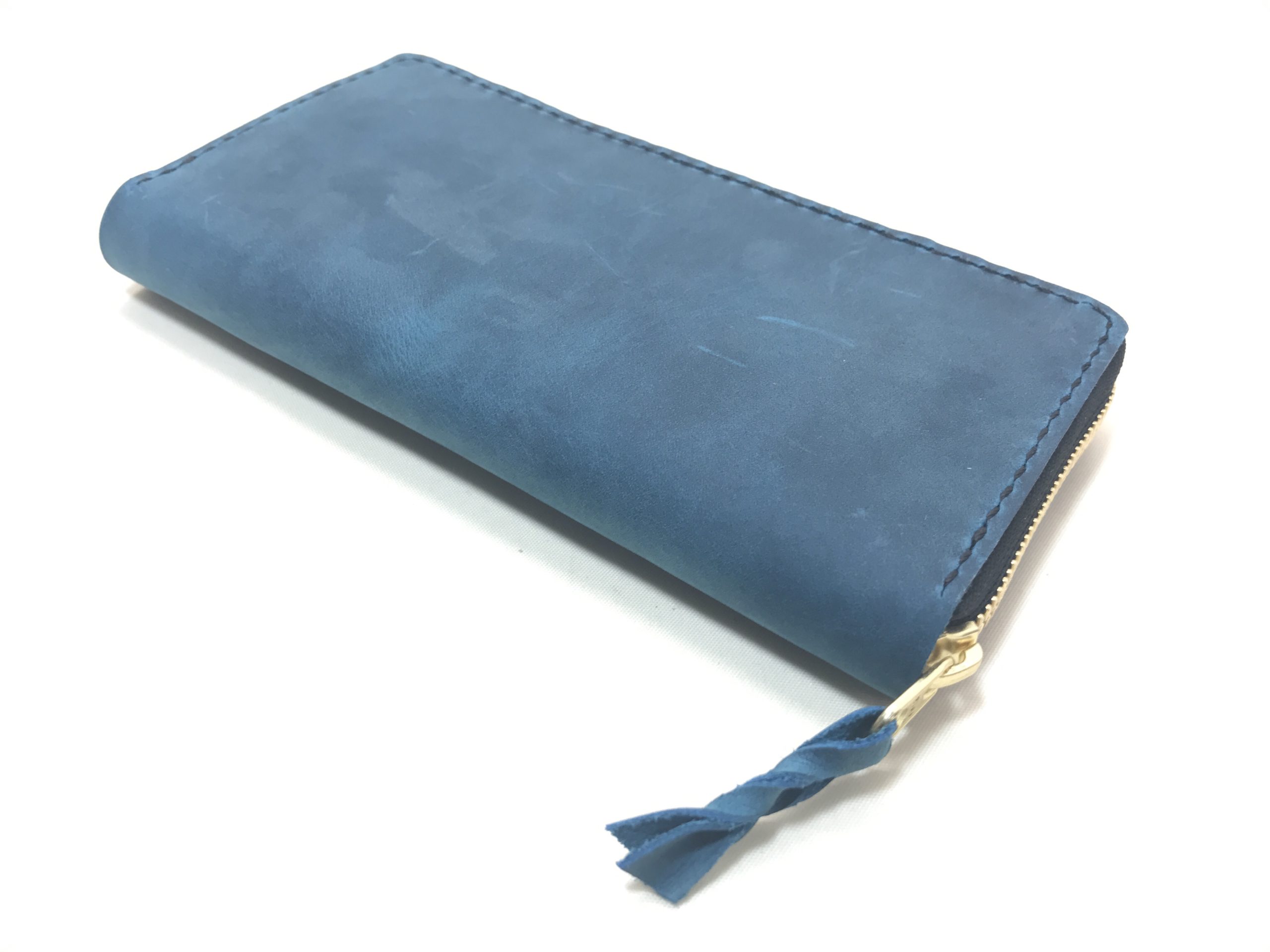 ターコイズとホワイトの組み合わせ お財布 2020.09.02 表面を細かく毛羽立たせた革を使ったラウンドファスナーのお財布です。 毛羽立ちで見る角度によって微妙に色合いが変わってみえるのはとても魅力がありますね。 内装は純白色で綺麗にまとまった仕上がりです!