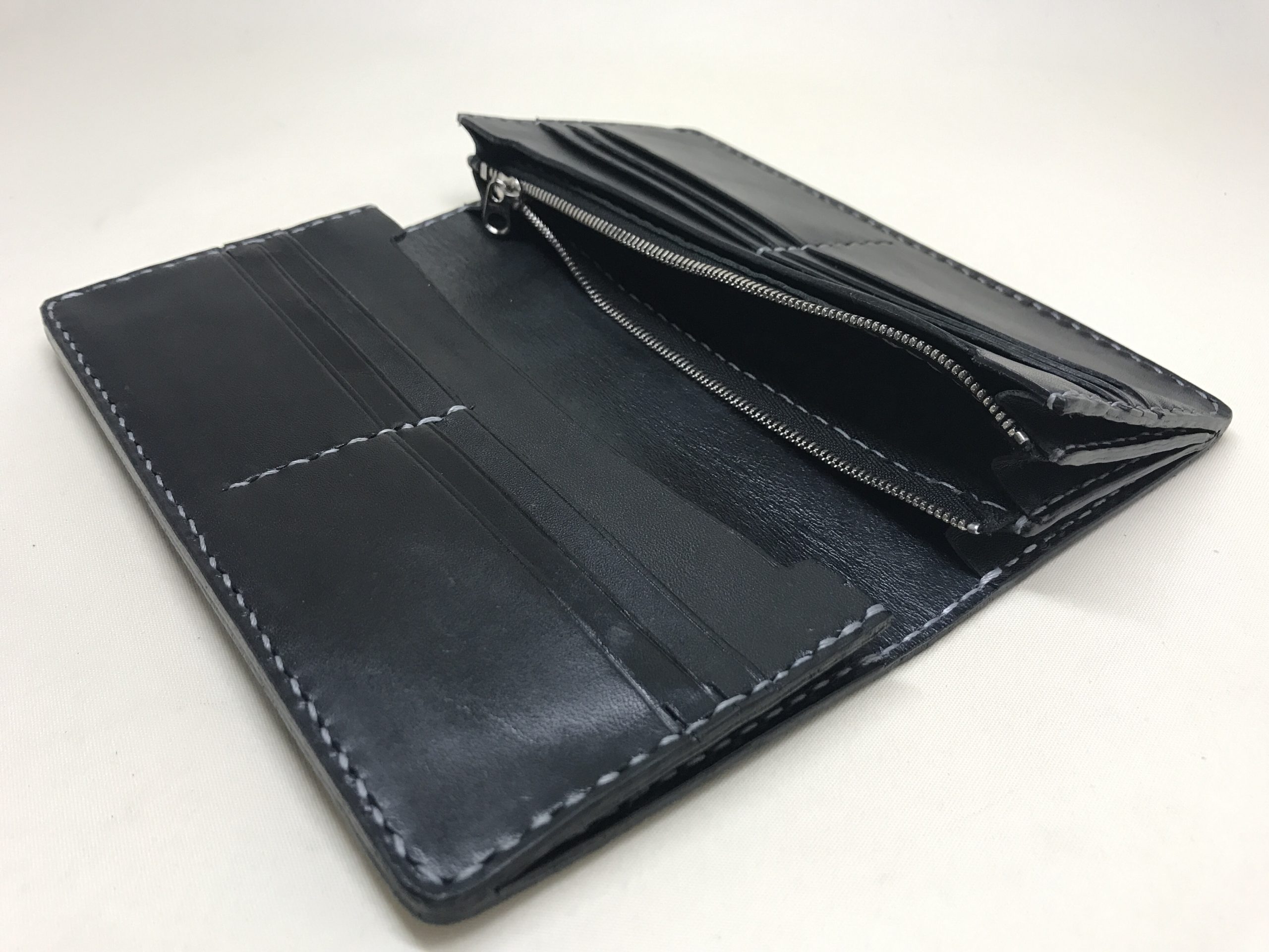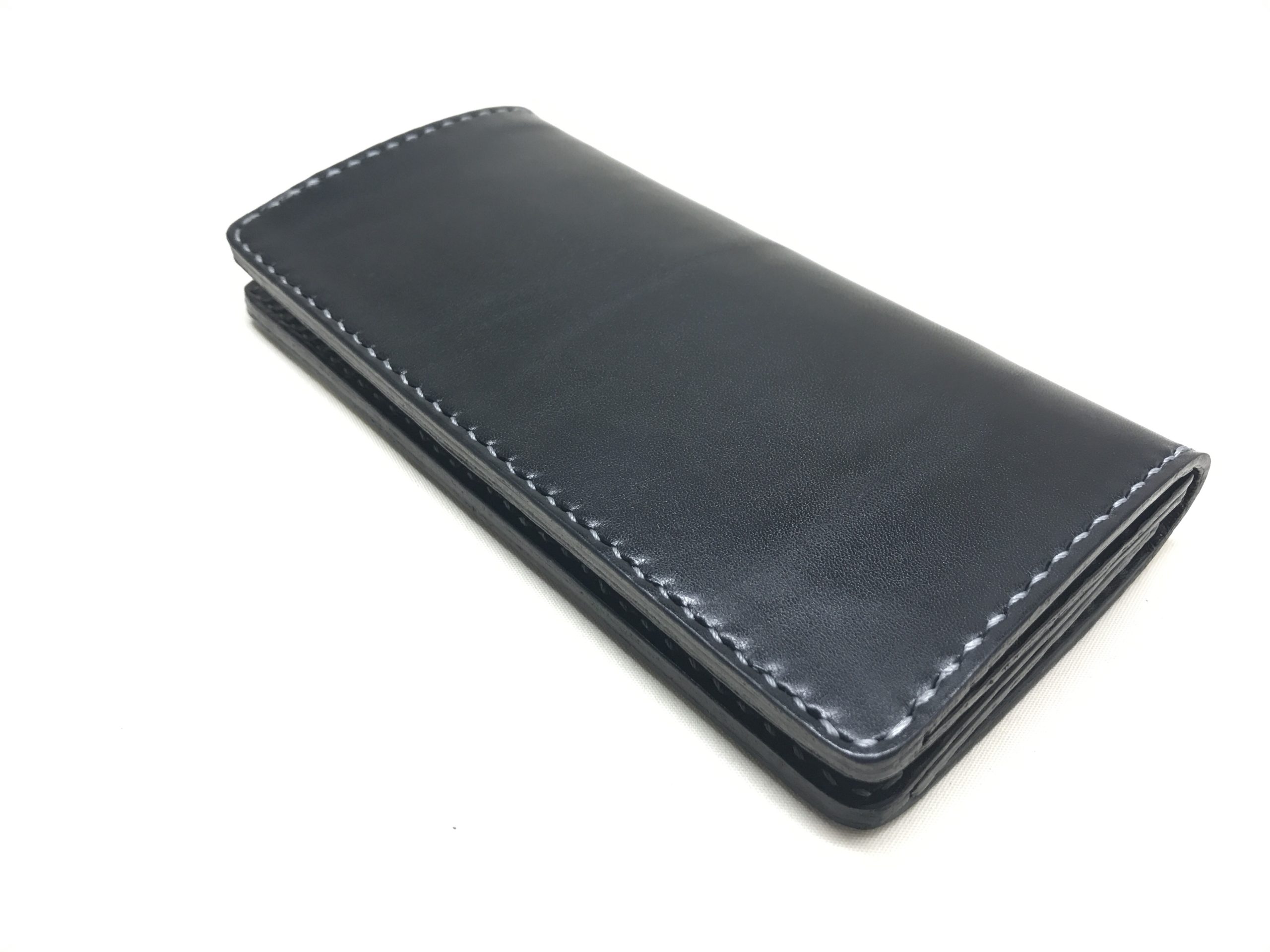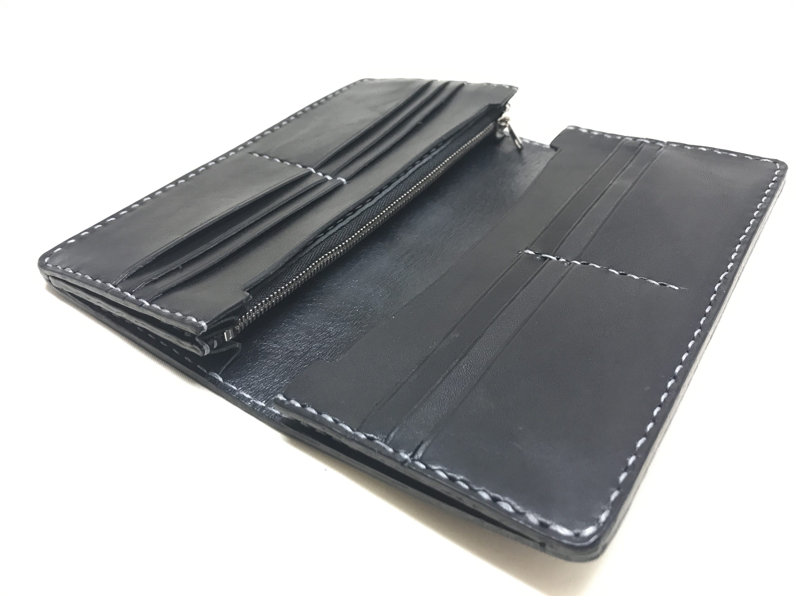 黒でまとめた長財布 お財布 2020.10.01 定番のヌメ革の長財布です。表革、裏革と黒で統一し、シルバー色の糸でまとめました。 使いやすさと丈夫さにこだわっておりまして、あまり厚みの内容に作っております。お客さんからも評判の良いレビューを多数頂いております!