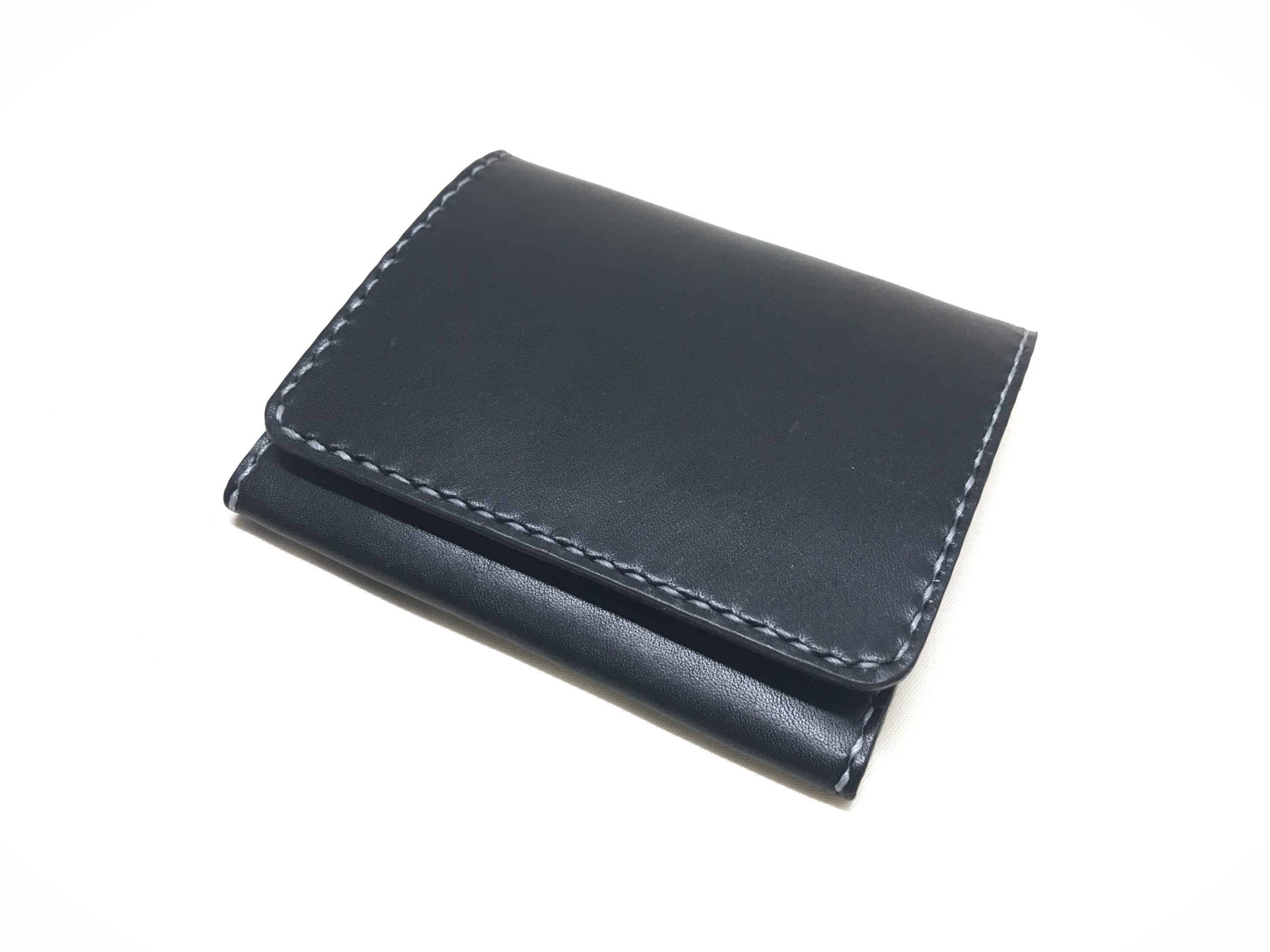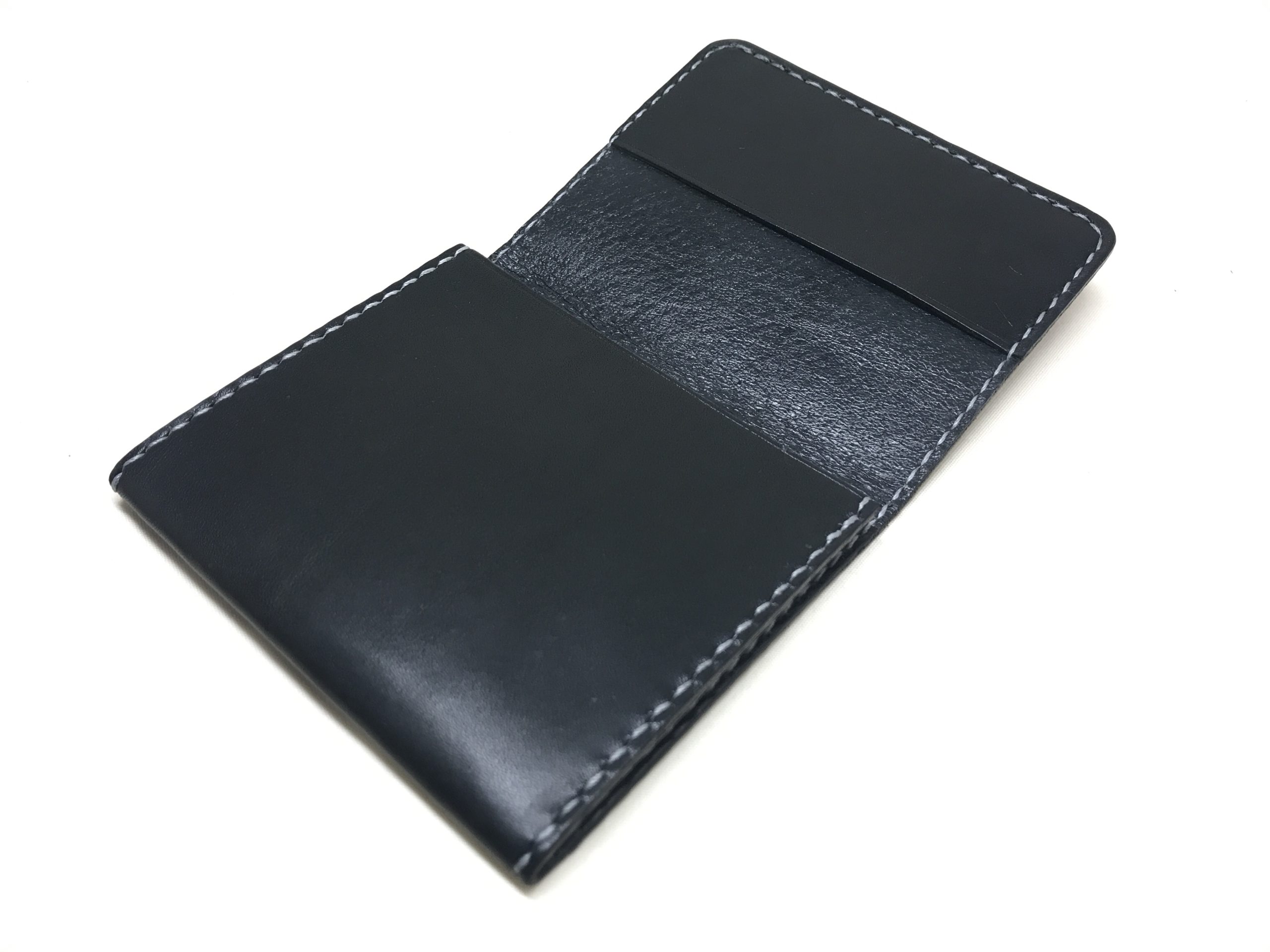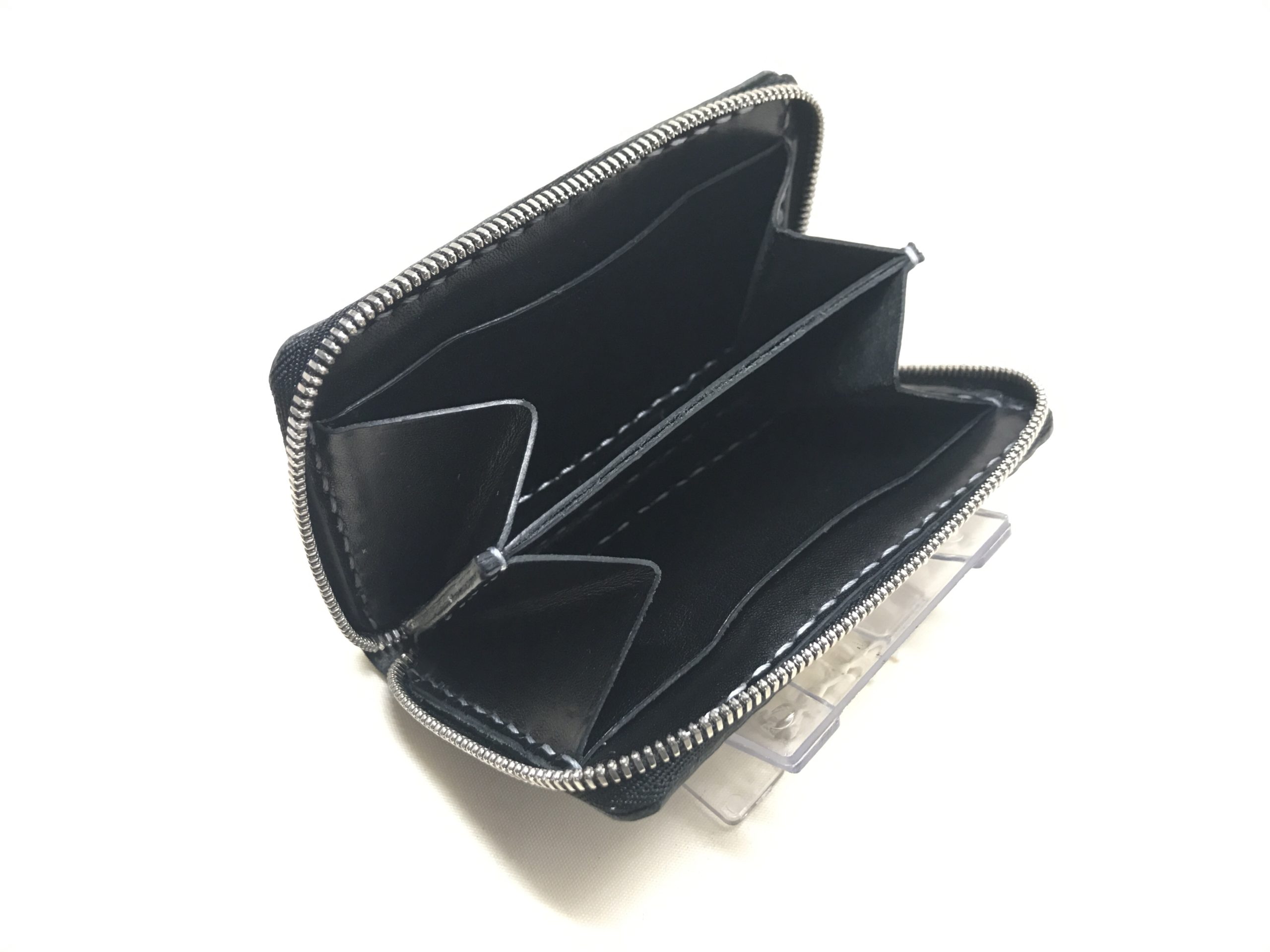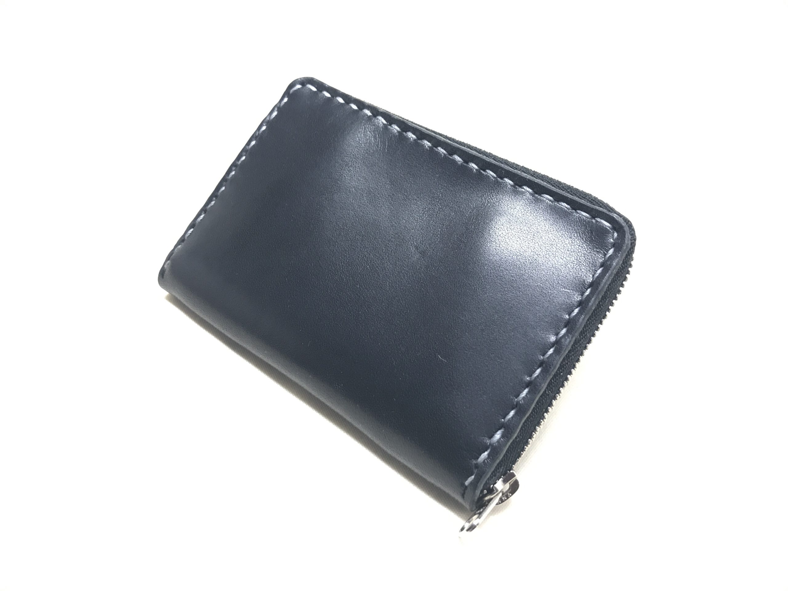 黒に銀色のステッチを合わせた手縫いのコインケースとパスケースです。