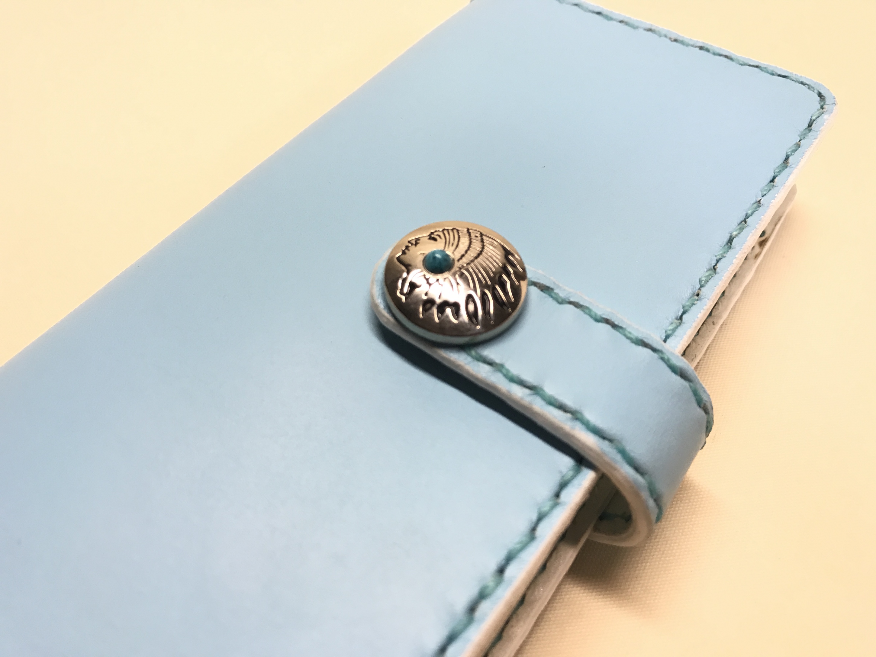 ストラップには小さめのコンチョを使いまして水色爽やかさがよく出ていると思います。