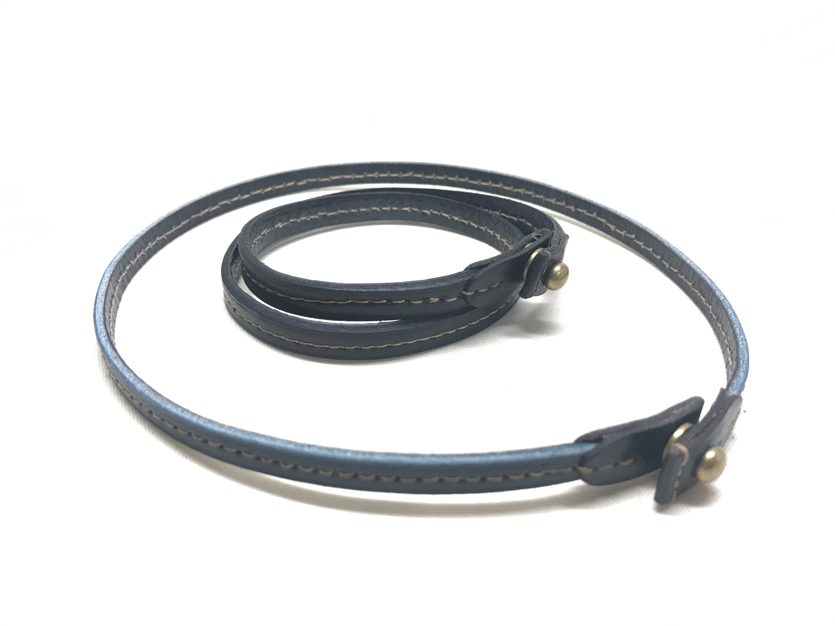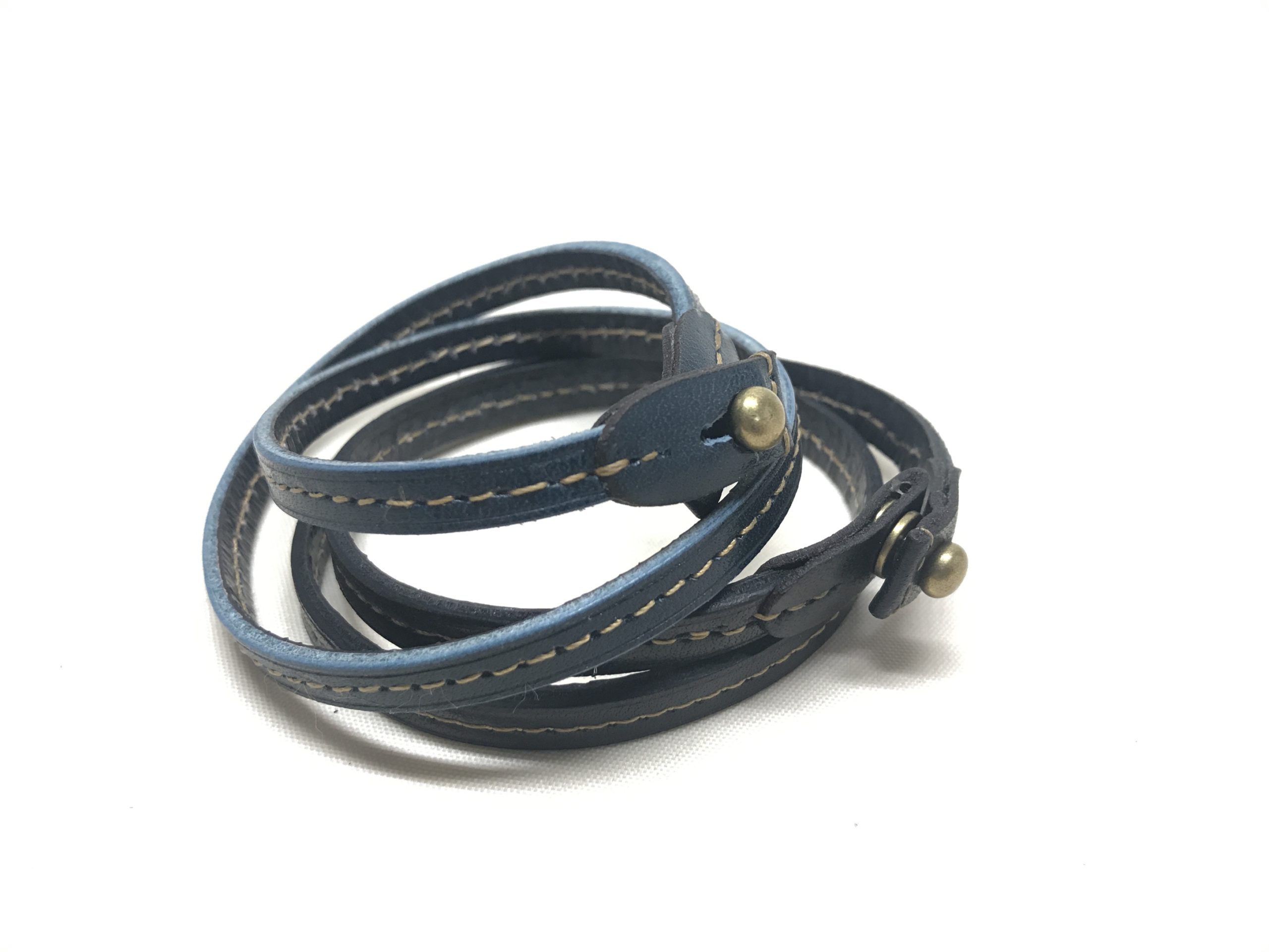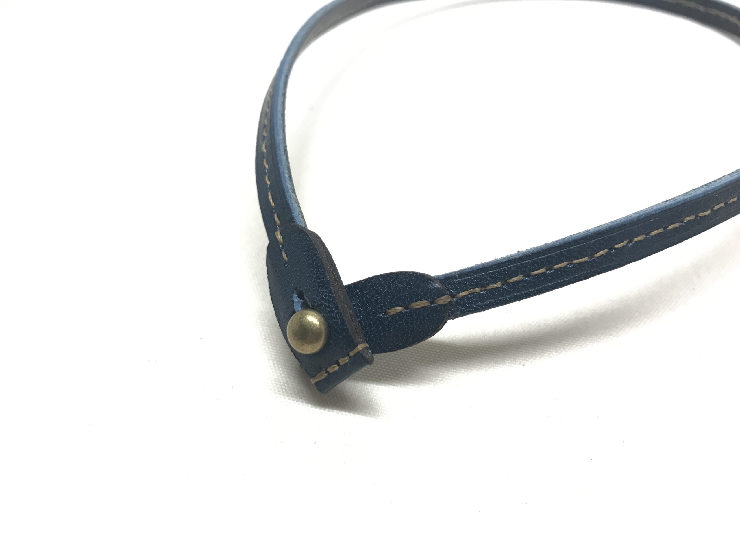 細身の #革 にステッチを効かせ金属の留め金を使用しております。