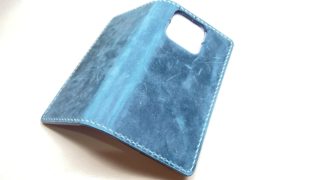 綺麗なムラのあるターコイズ色のiPhoneケースのオーダーを頂きました!表面を少し毛羽出せオイルを入れている牛革を使用!お客様のお使いにあわせて、フラップなし、左利き用にお作りしております