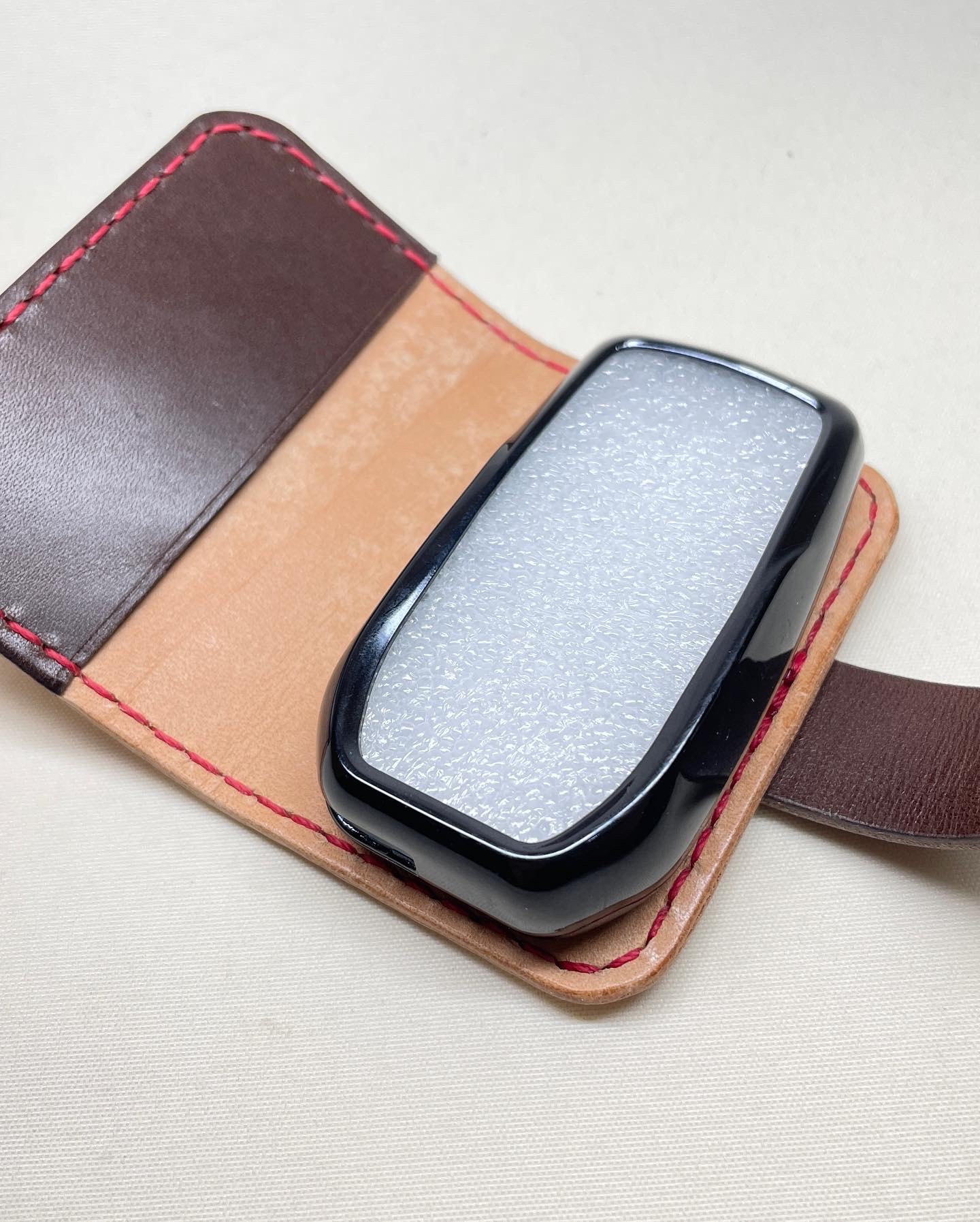 手帳型キーケース 創作革小物/スマホケース 2022.04.15 車のスマートキーはキーケースに収めるにはすこし大きすぎると言う要望に作ったケースです😊スマートキー専用の手帳型ケースです!家などの鍵も付ける穴もあけられますので、ひとまとめにできます😊
