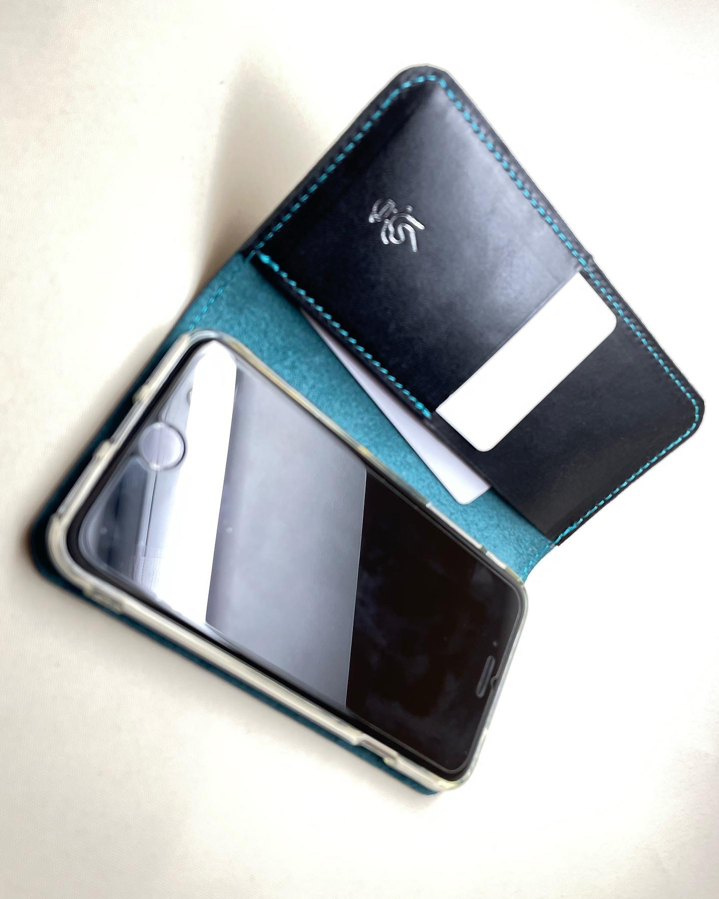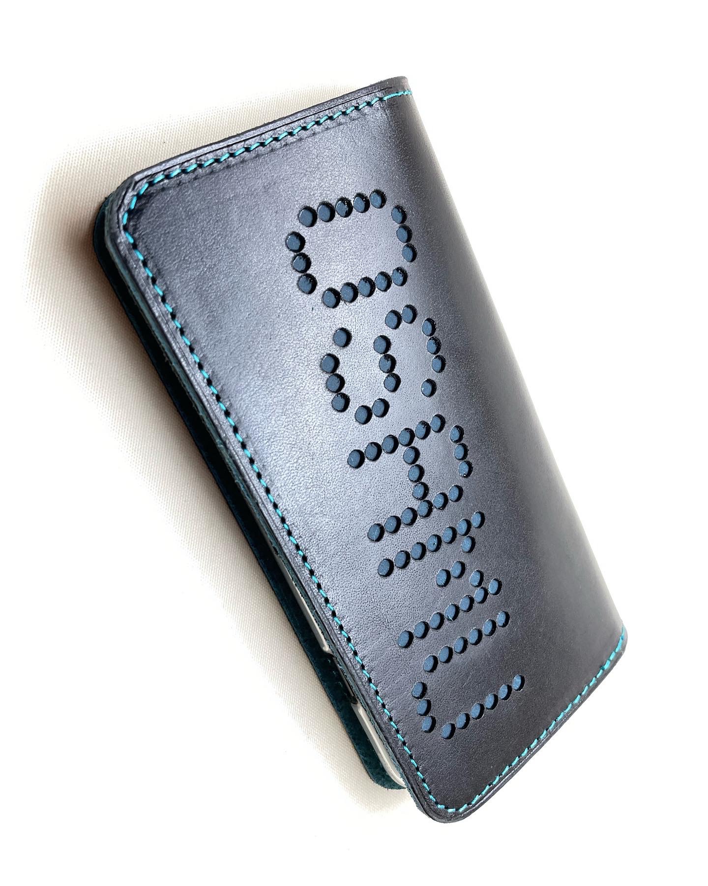文字の形に穴をあけました 創作革小物/スマホケース 2022.05.14 丸い穴を文字の形に合わせて切り抜いて、下地の色を変えるオーダー頂きました😆先日1年半のメンテナンスにお越し頂き、新品の時と遜色なく使えており、とても喜んで頂けました☺️太鼓判も頂けまして本当に感謝しております!これが #レザー の丈夫さです!