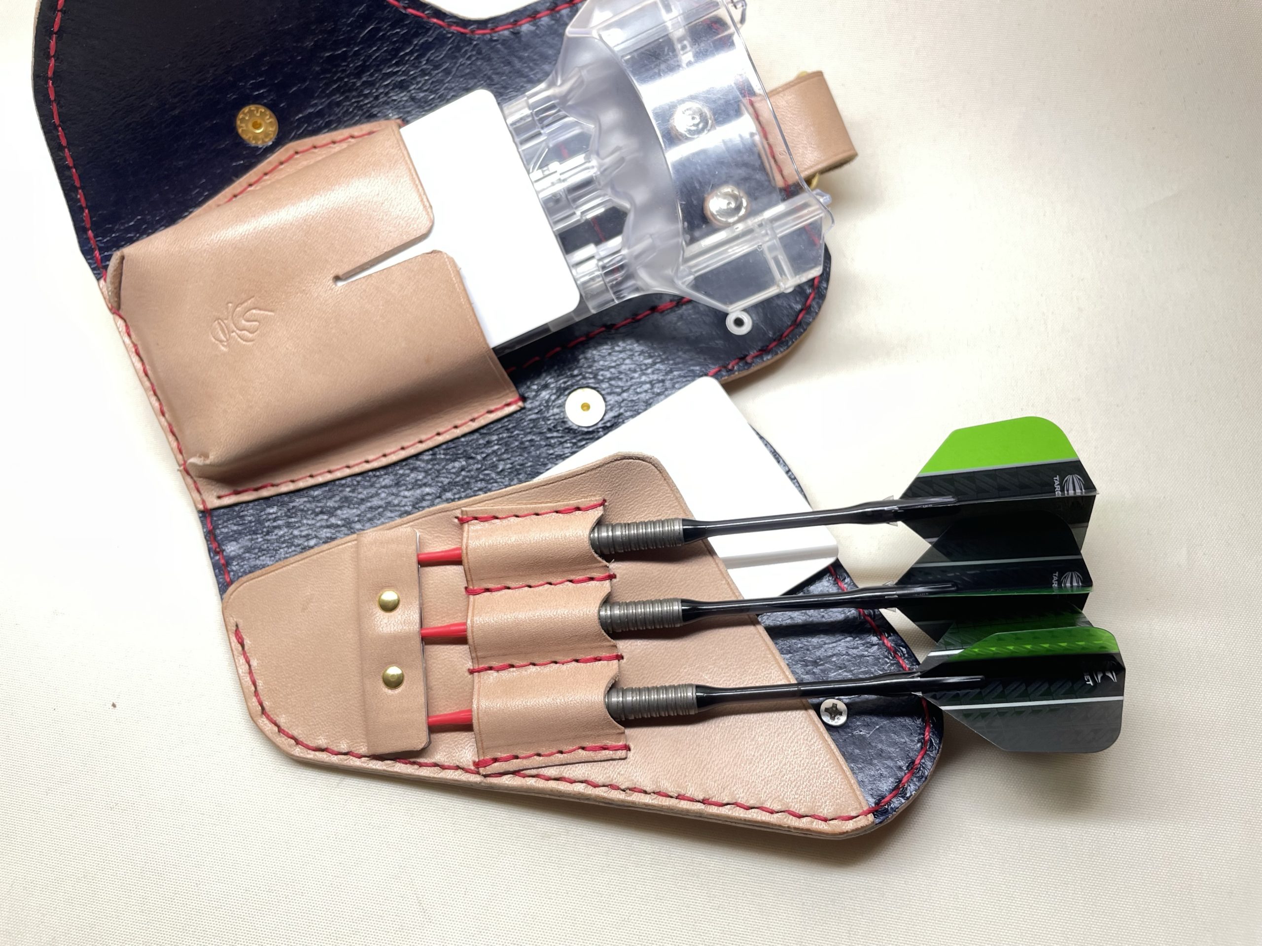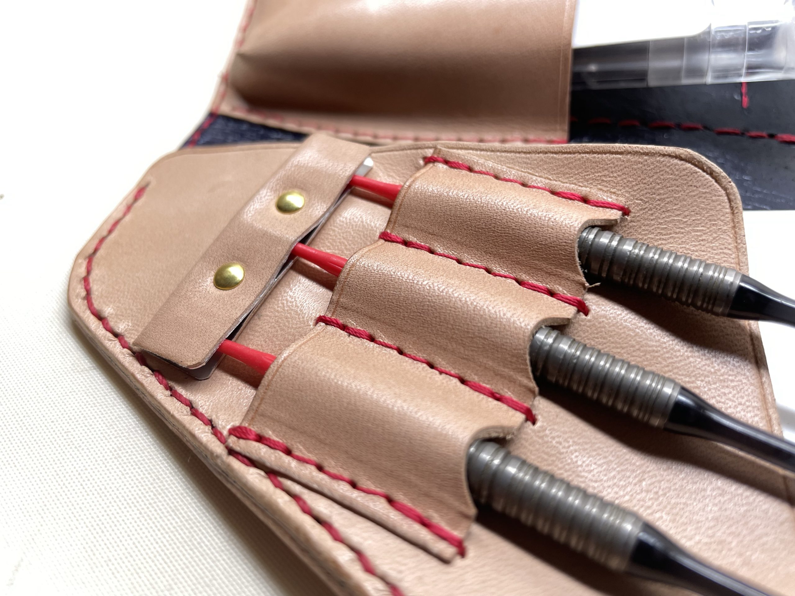 丈夫なダーツケース ダーツケース/グッズ 2022.09.10 10年前よりずっと人気のあるモデルのダーツケースのご注文を頂きました☺️市販の樹脂ケースが収納でき、小物ポケットもお客様のご要望に合わせてお作りできます👍 合皮はすぐに破れてしまって結果もったいないという方にとにかく丈夫な本革ケースはおすすめです!😆