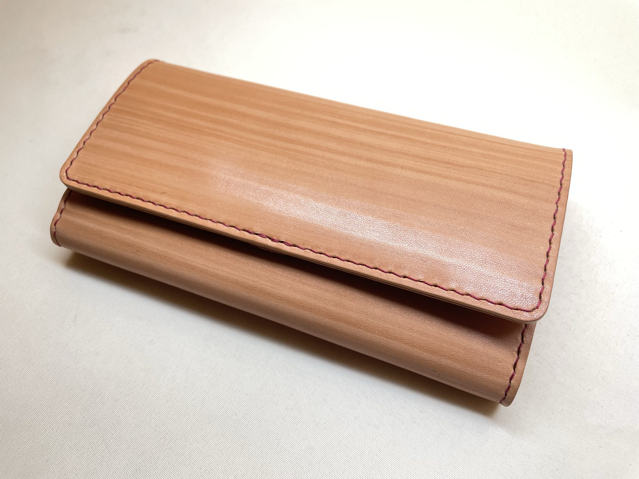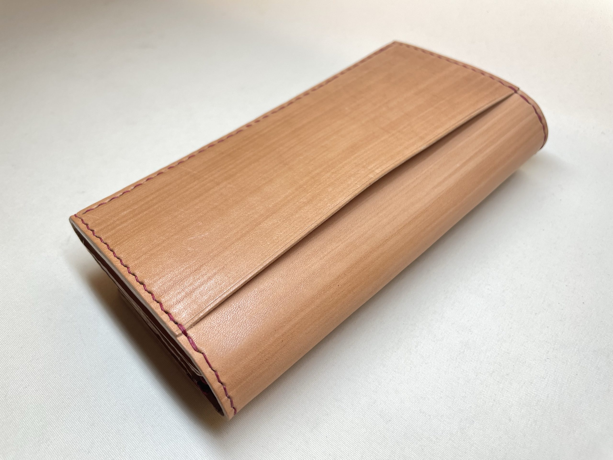 かぶせ長財布です お財布 2022.12.08 当店定番のかぶせ長財布です☺️木目のような風合いになる様にムラを計算しハケにて染色した柿渋染めレザーをご注文の際にお選び頂きました!天然染料&天然皮革のヌメ革のコンビネーションをお試しください☺️