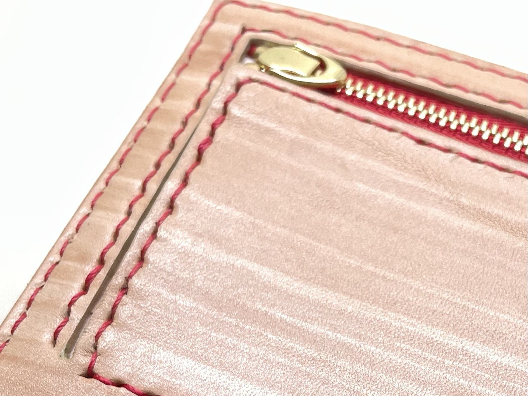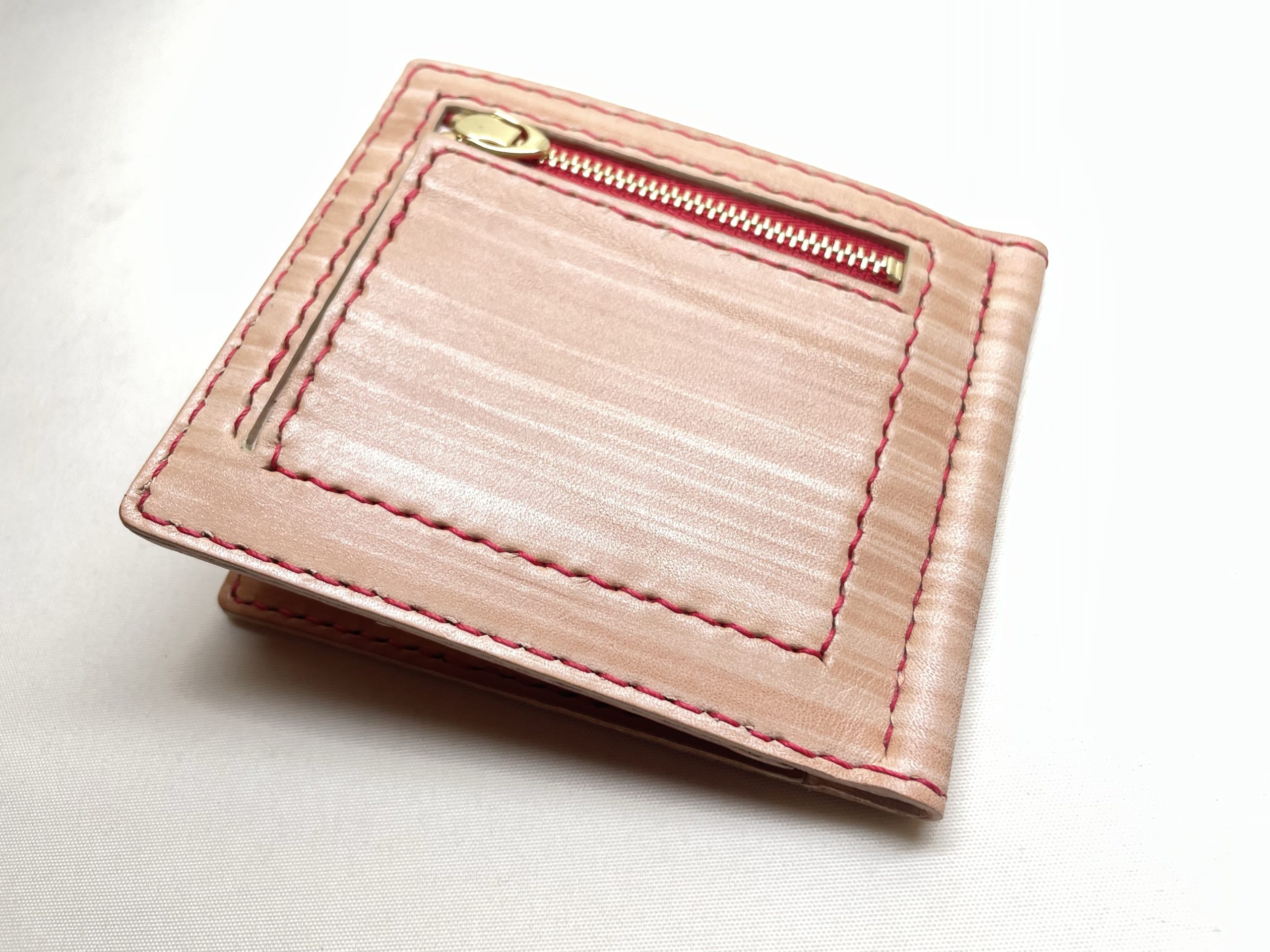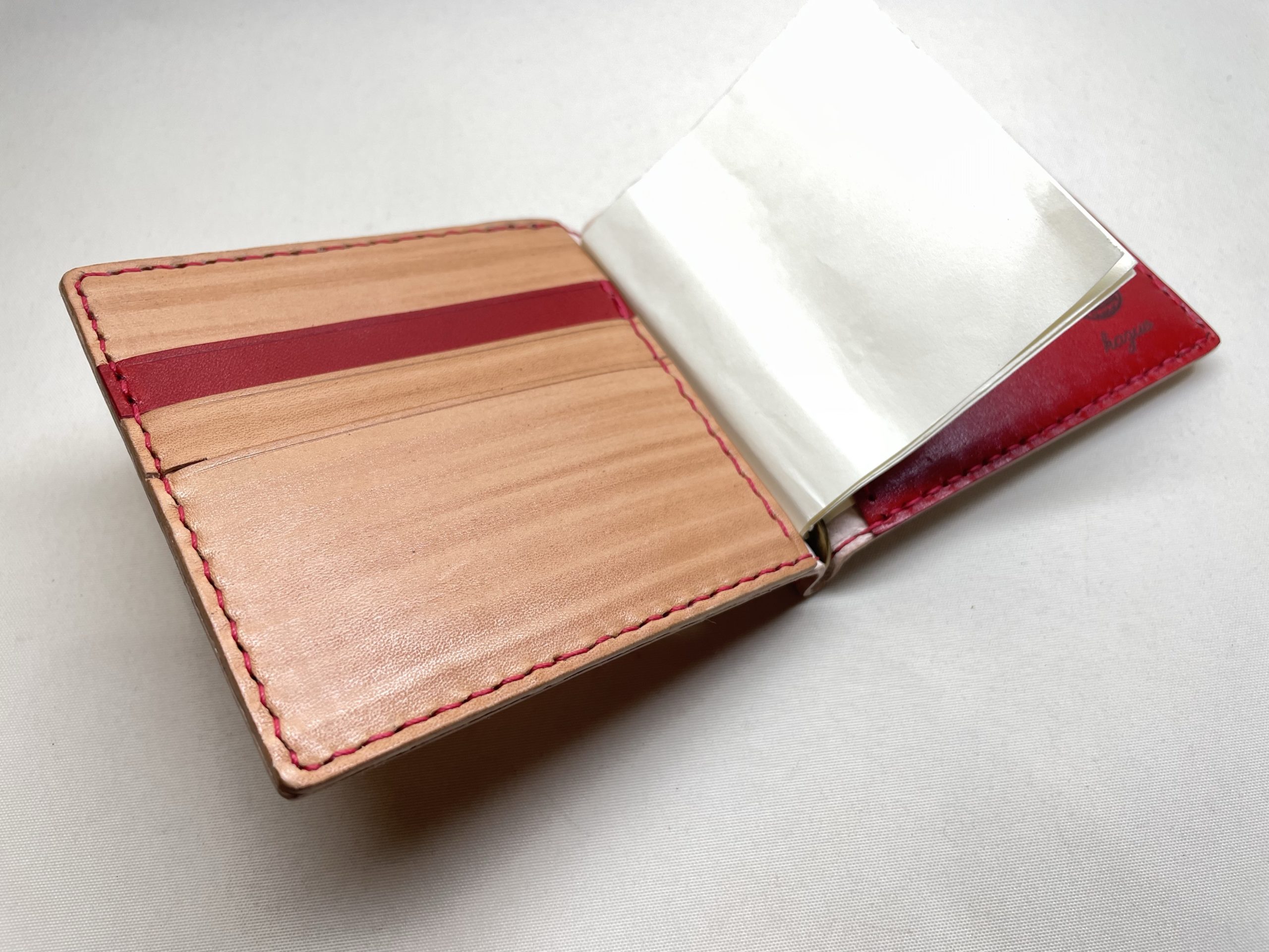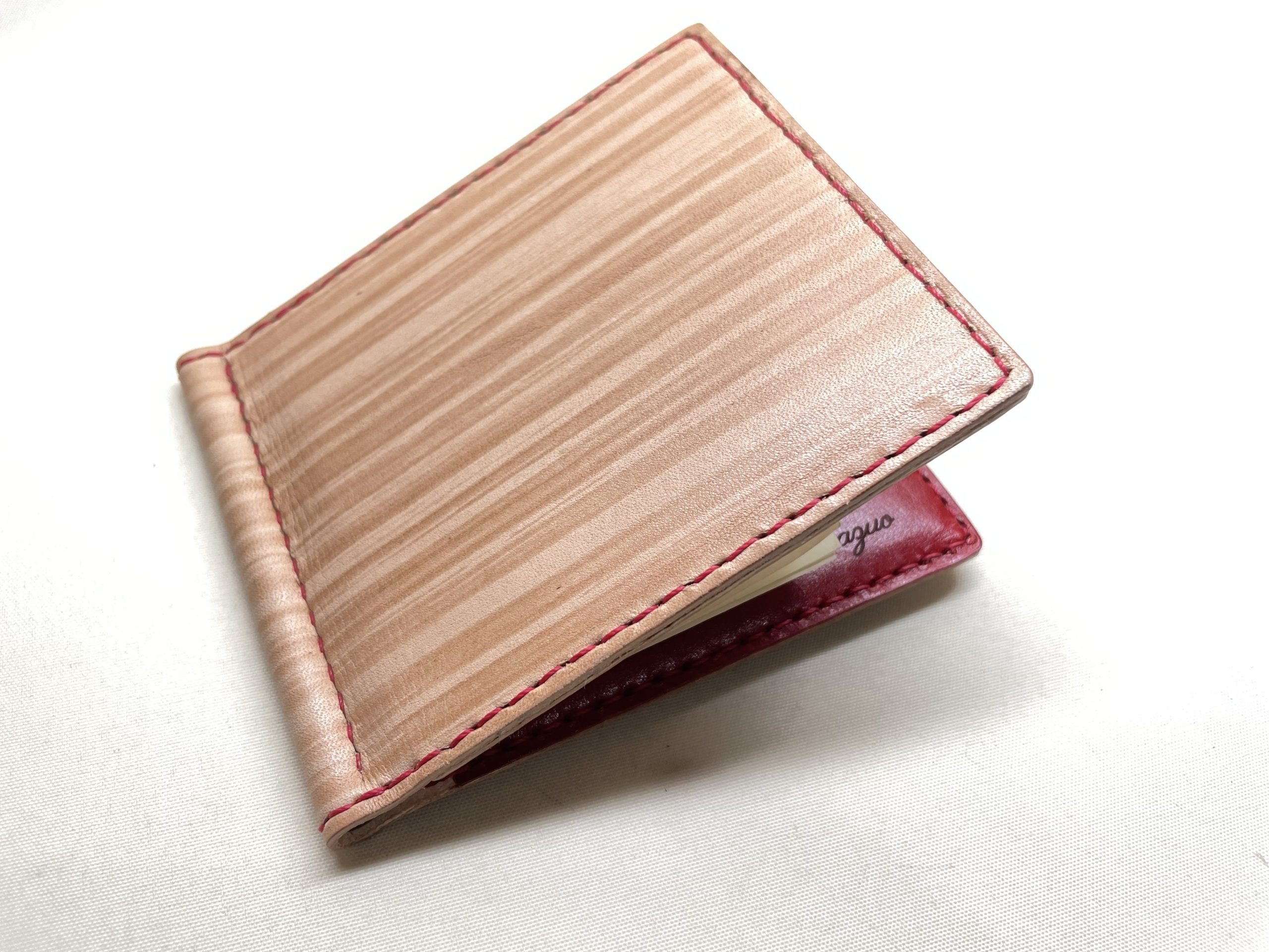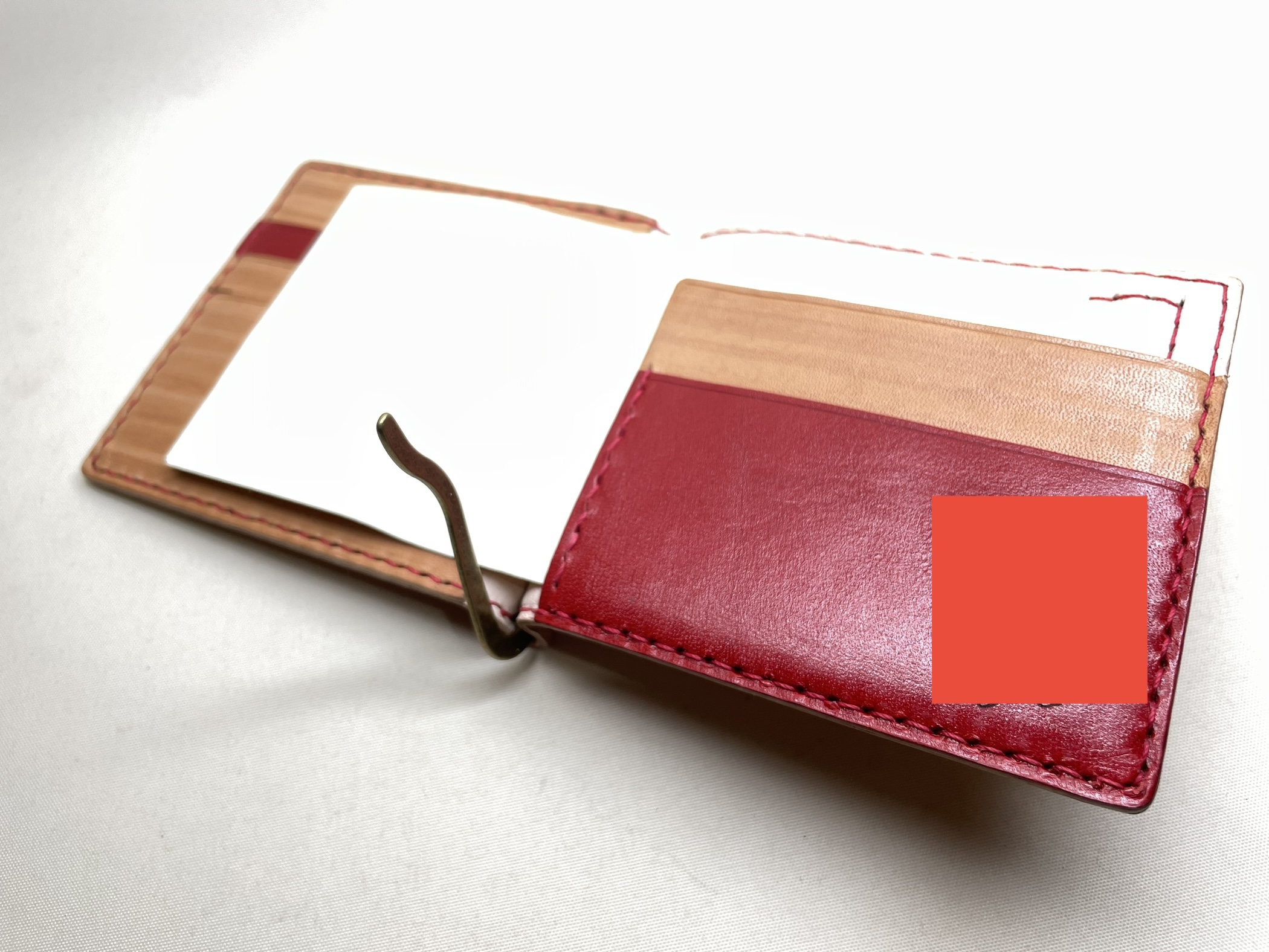マネークリップを使用した二つ折り財布 お財布 2023.03.09 マネークリップを使用した二つ折り財布です☺️当店で木目の様に染めた柿渋染めレザーをメインに、赤を合わせて仕上ております!とてもすっきりとした二つ折り財布に仕上がりました!