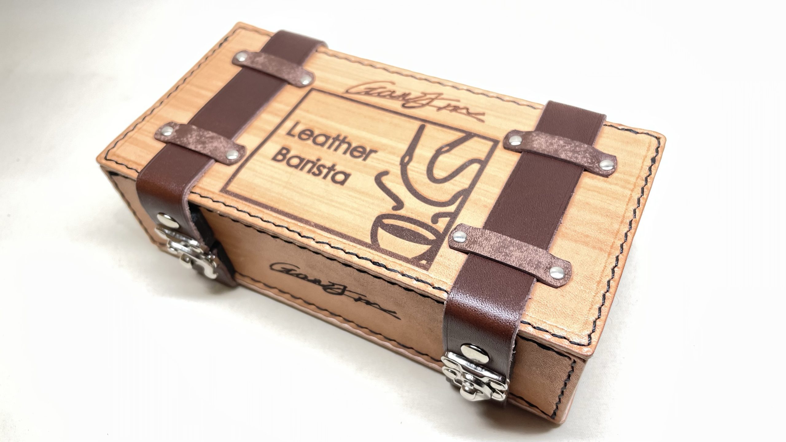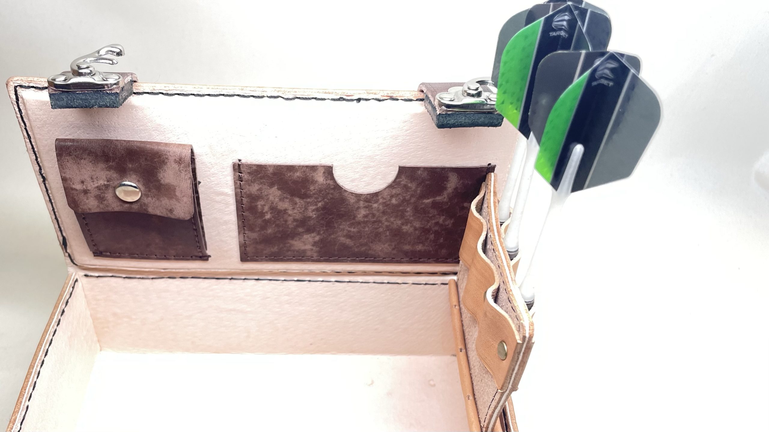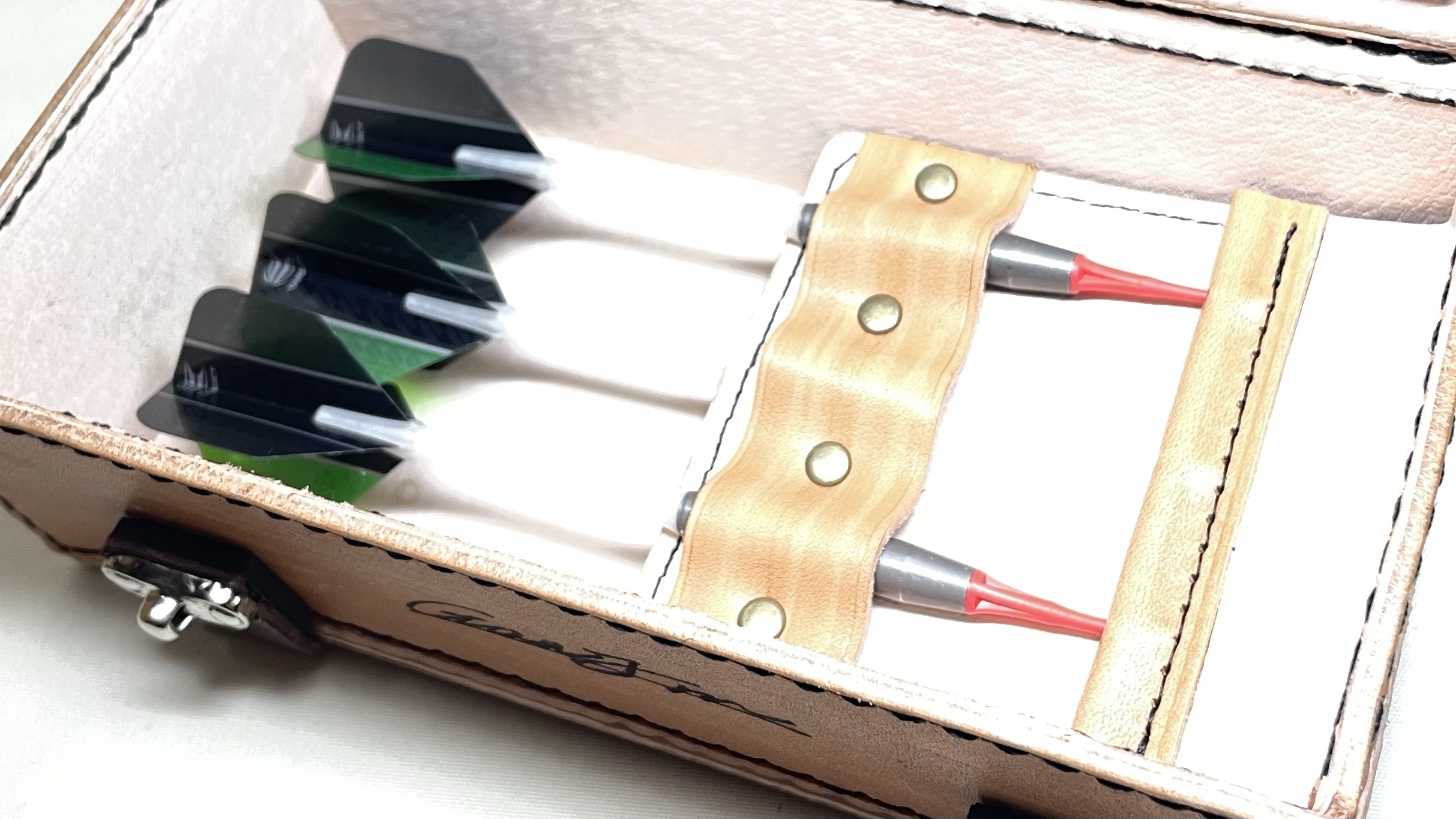トランク型のめずらしいダーツケース ダーツケース/グッズ 2023.03.21 perfectプロダーツ選手の佐藤昌太選手の@Ganjin_DOトランクをイメージした箱型のダーツケースです☺️ご本人のサインも全面にアピールしつつ、とてもかわいいデザイン、機能にもこだわりました!高価なヌメ革のみで作ってますが、ご予算に合わせて作り方や素材を変えてコスパ重視でお作りしました!