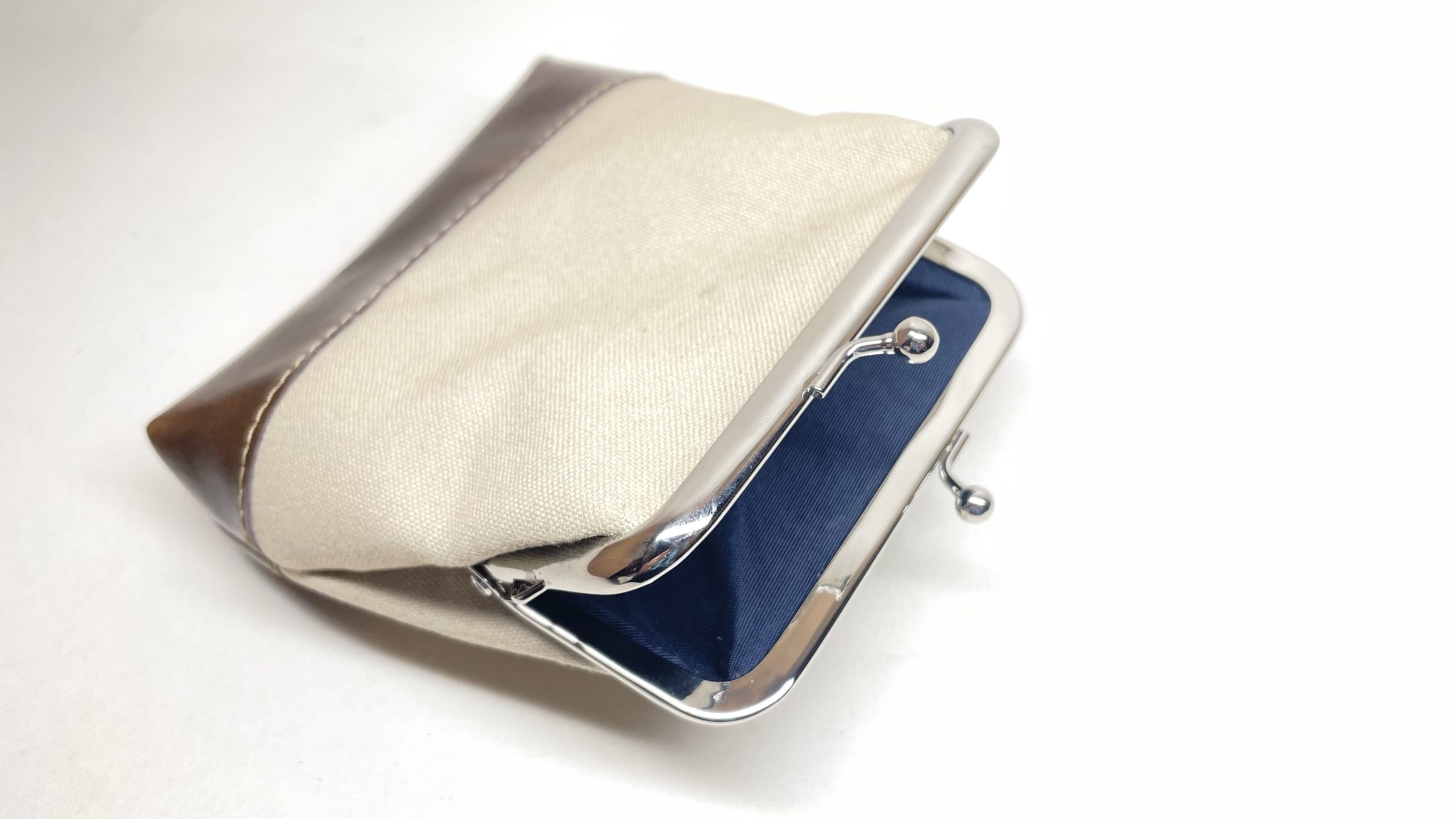 ガマ口と帆布と革 お財布 2023.04.05 革と厚手の帆布を使ったガマ口です☺️底部分に革を使っておりますので、全部が布で造られている物より破けに強くより長くお使い頂けます!ガマ口の製作は口金の取り付けや型紙などの若干コツがいる手順ですが、便利で使い勝手の良い製品が作れます!