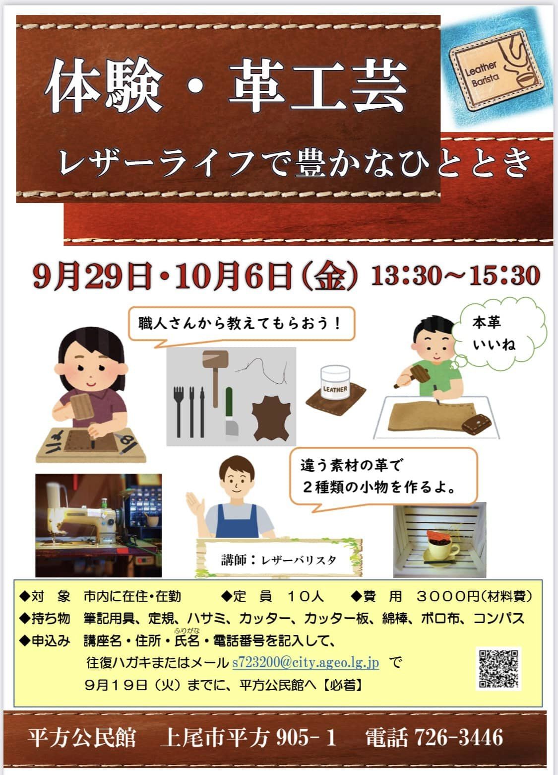 私が講師を勤める体験・革工芸の教室が上尾市の主催で開催されます!