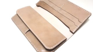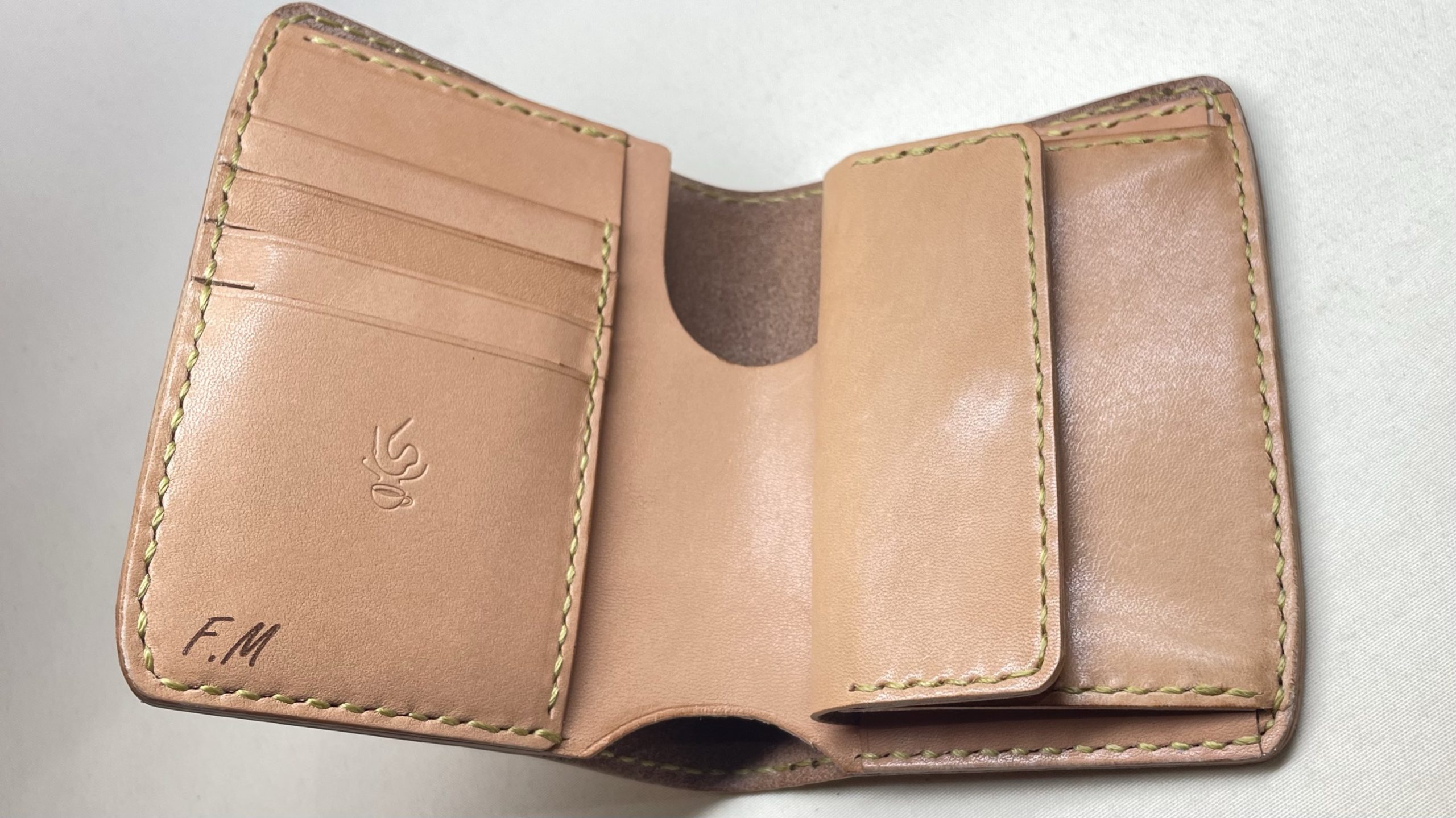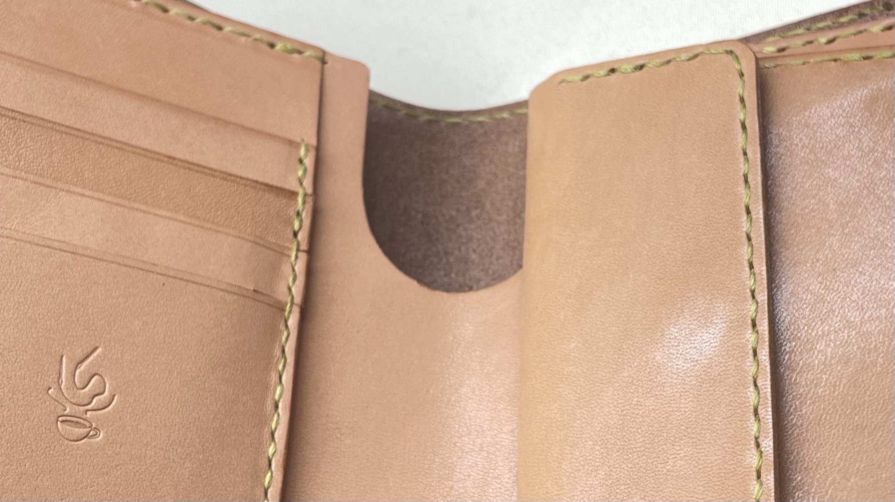 ミディアムサイズの二つ折り財布です お財布 2023.10.19 定番商品のミディアム二つ折り財布です☺️絶妙にカーブを描いたラインで作っており、一手間も二手間もかかったデザインをしております!高さがあるので小銭やカード類はより多く収納可能できますワンポイントでネーム入れも施せますよ😉