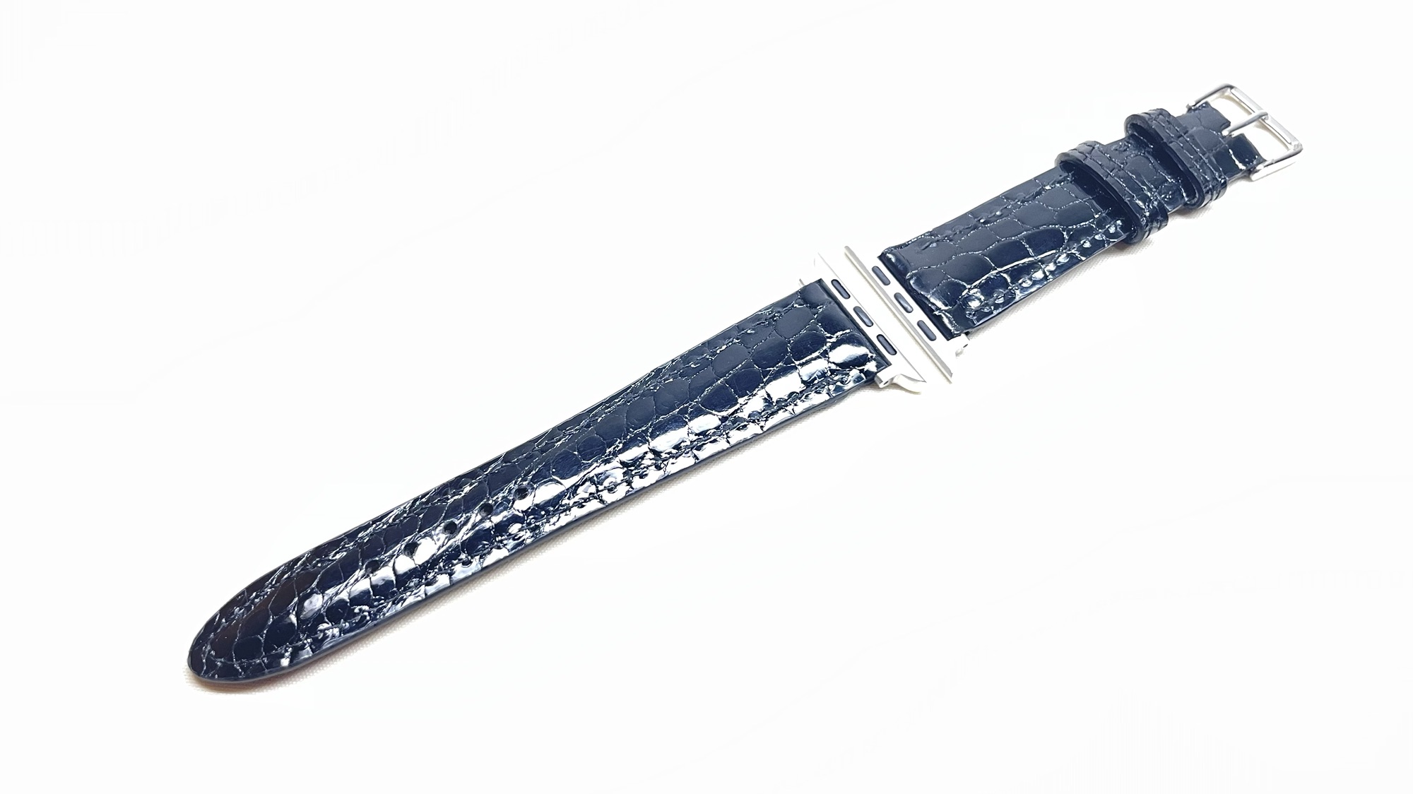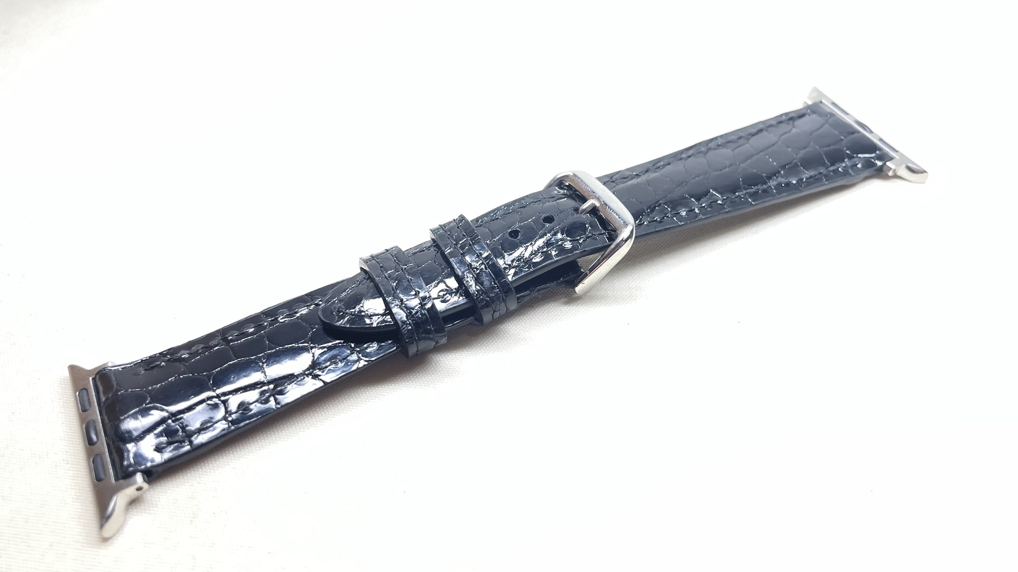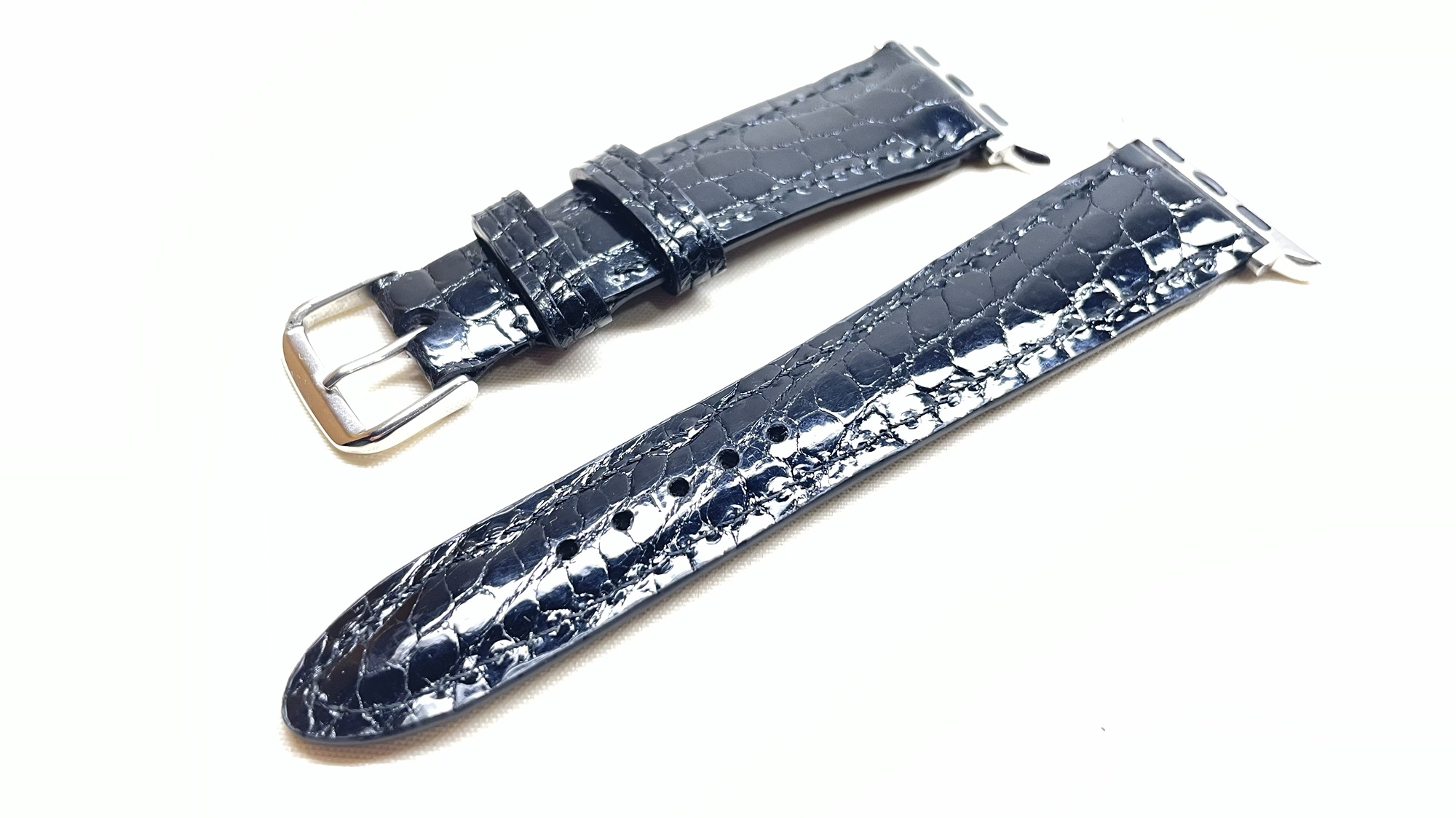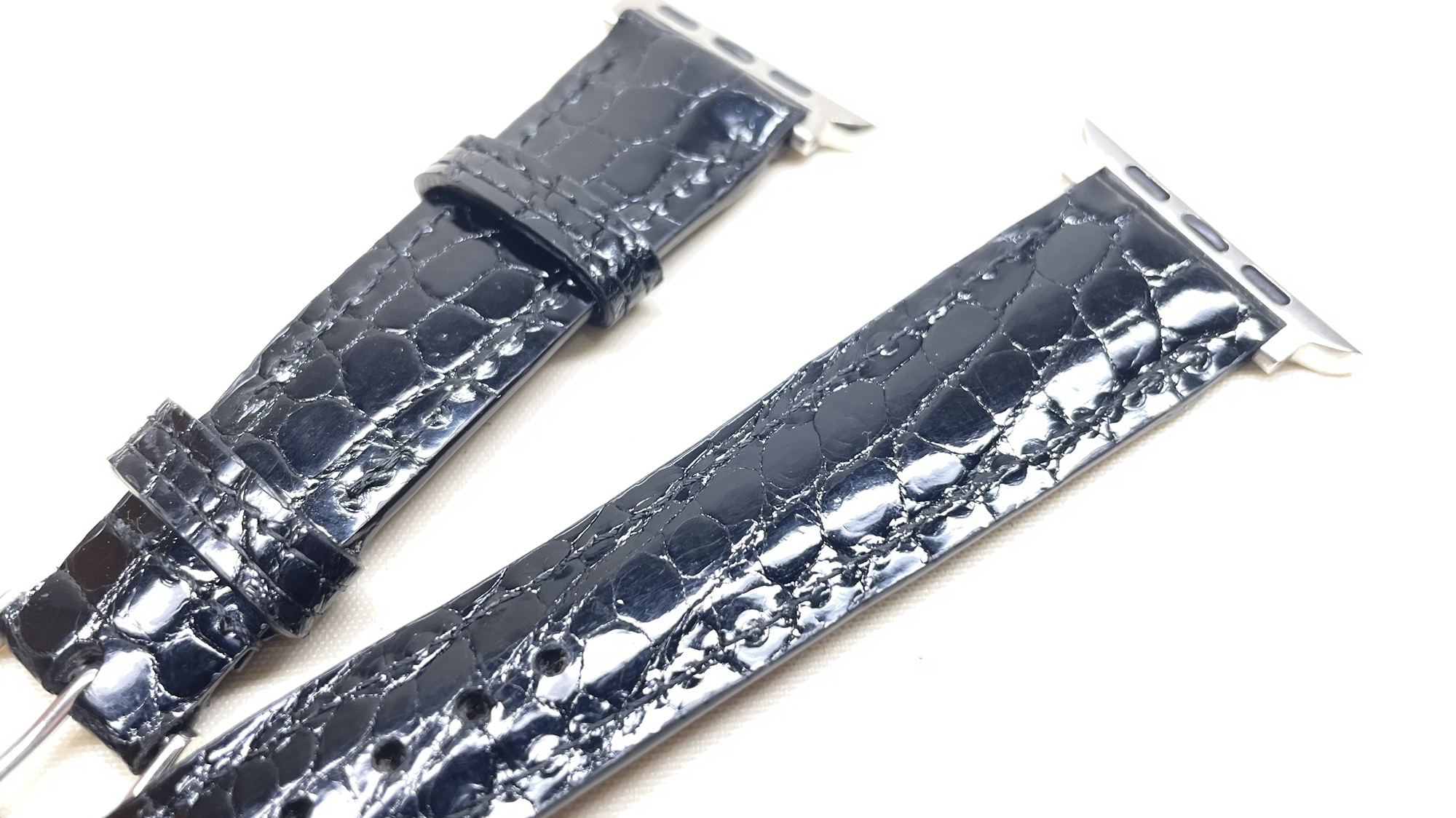 クロコダイルの時計ベルト 創作革小物/スマホケース 2024.06.13 Apple Watchの時計ベルトのオーダーを頂きました☺️表にはクロコダイルの革、裏にはルガトヌメ革の銀面を使用という超高級仕様です完全フルオーダーですので世界に一つしかありません😆時計のバンドは小さいので0.5ミリのズレでも仕上がりに大きく影響しますので慎重に製作しております☺️