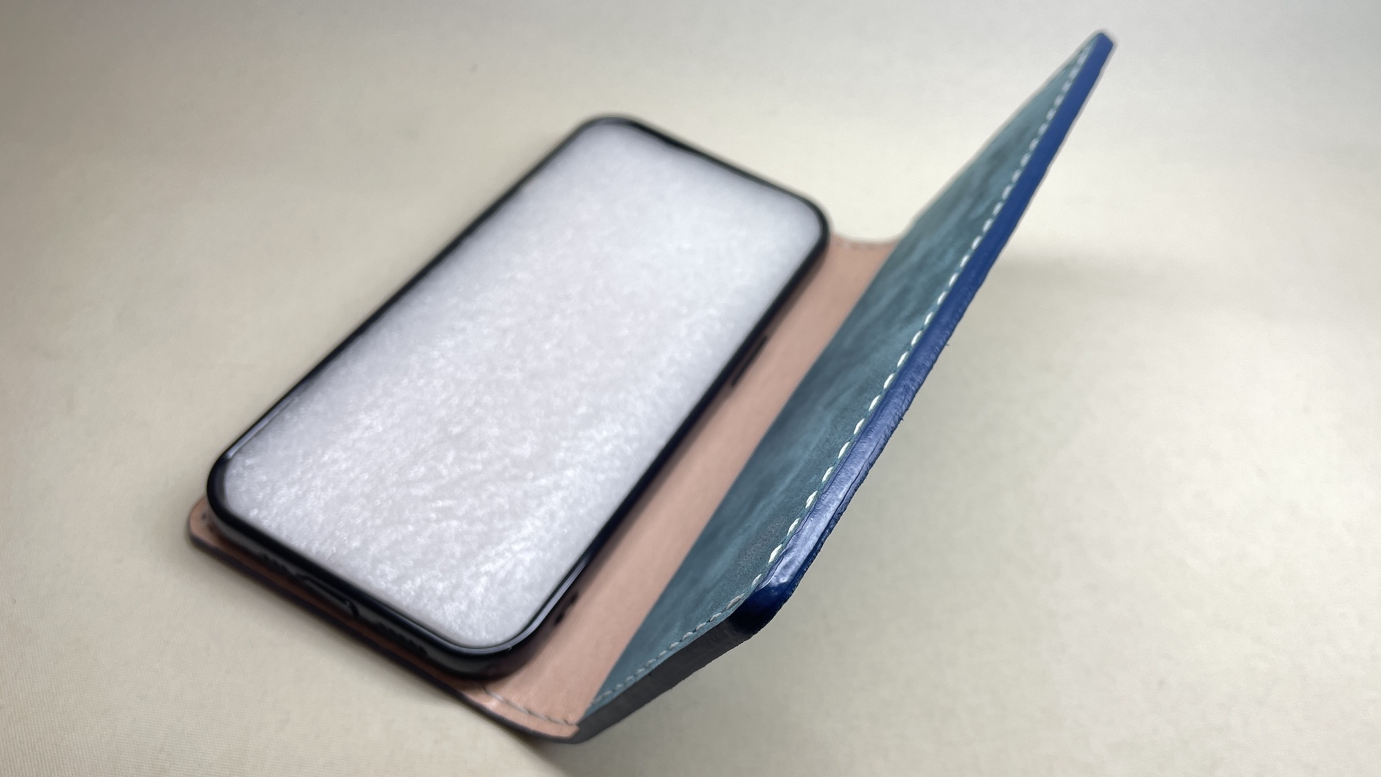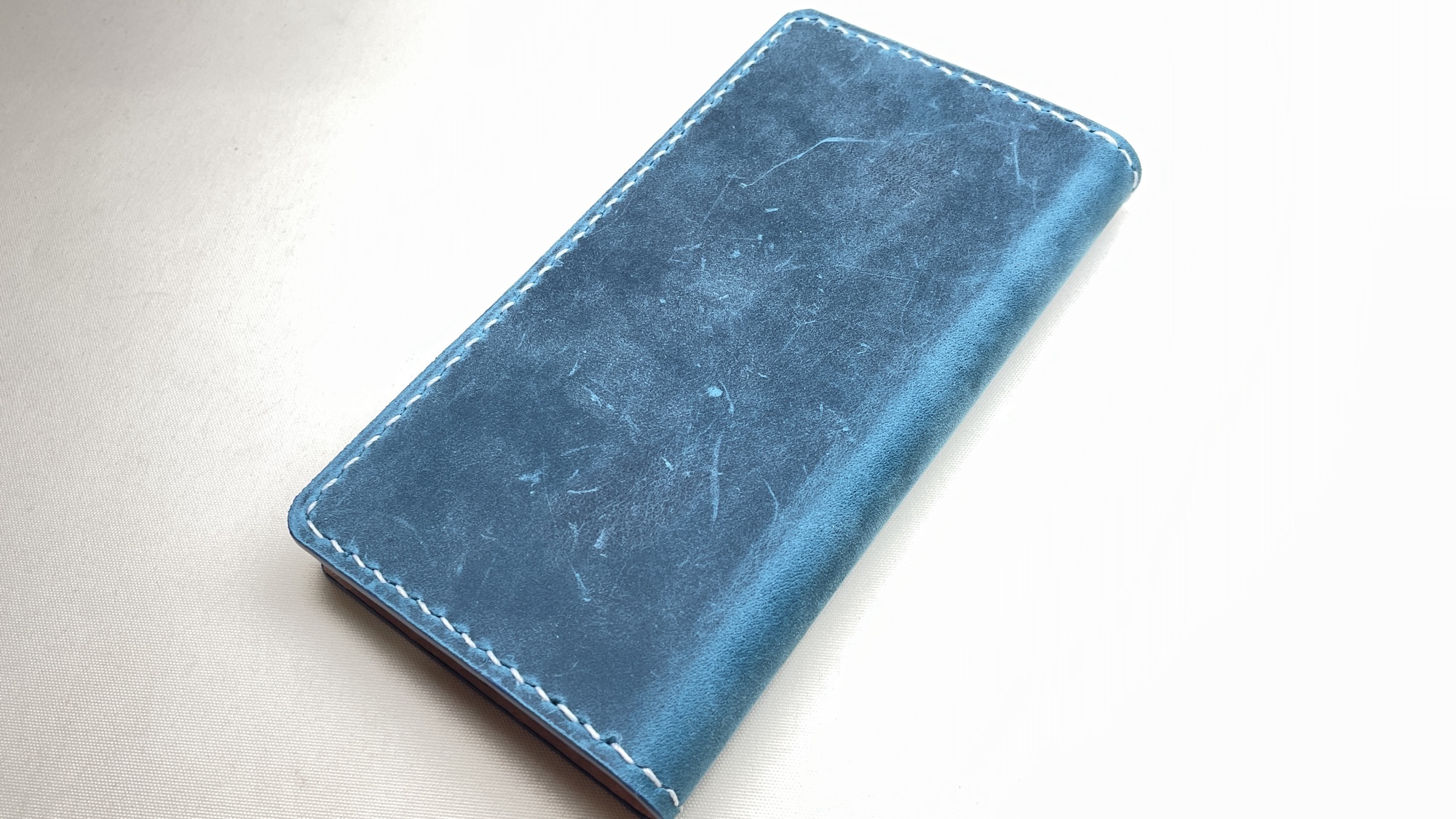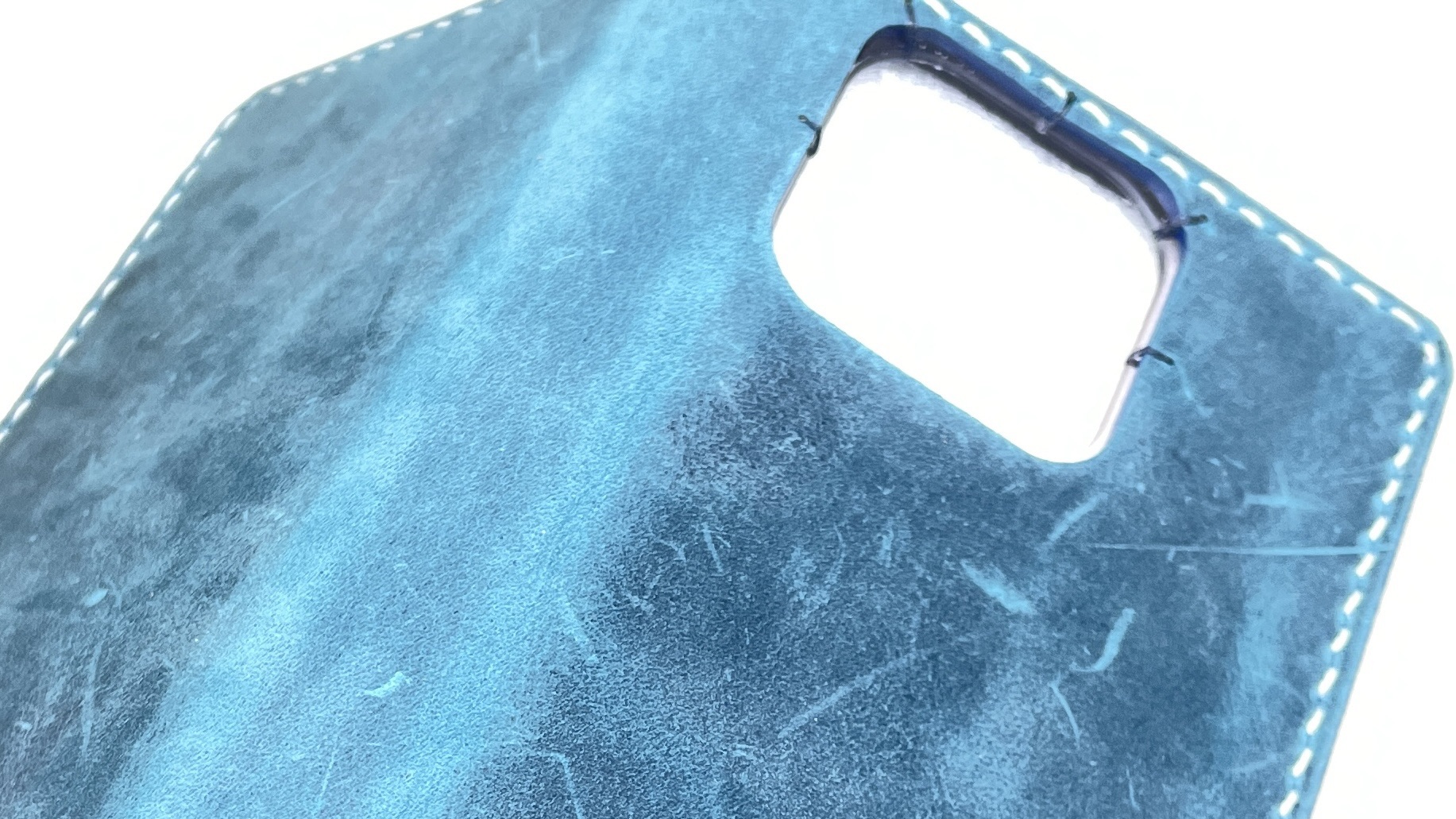 綺麗なムラのあるターコイズ色のiPhoneケース 創作革小物/スマホケース 2025.02.05 綺麗なムラのあるターコイズ色のiPhoneケースのオーダーを頂きました!表面を少し毛羽出せオイルを入れている牛革を使用!お客様のお使いにあわせて、フラップなし、左利き用にお作りしております
