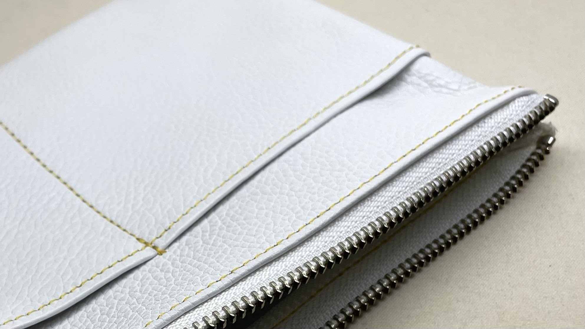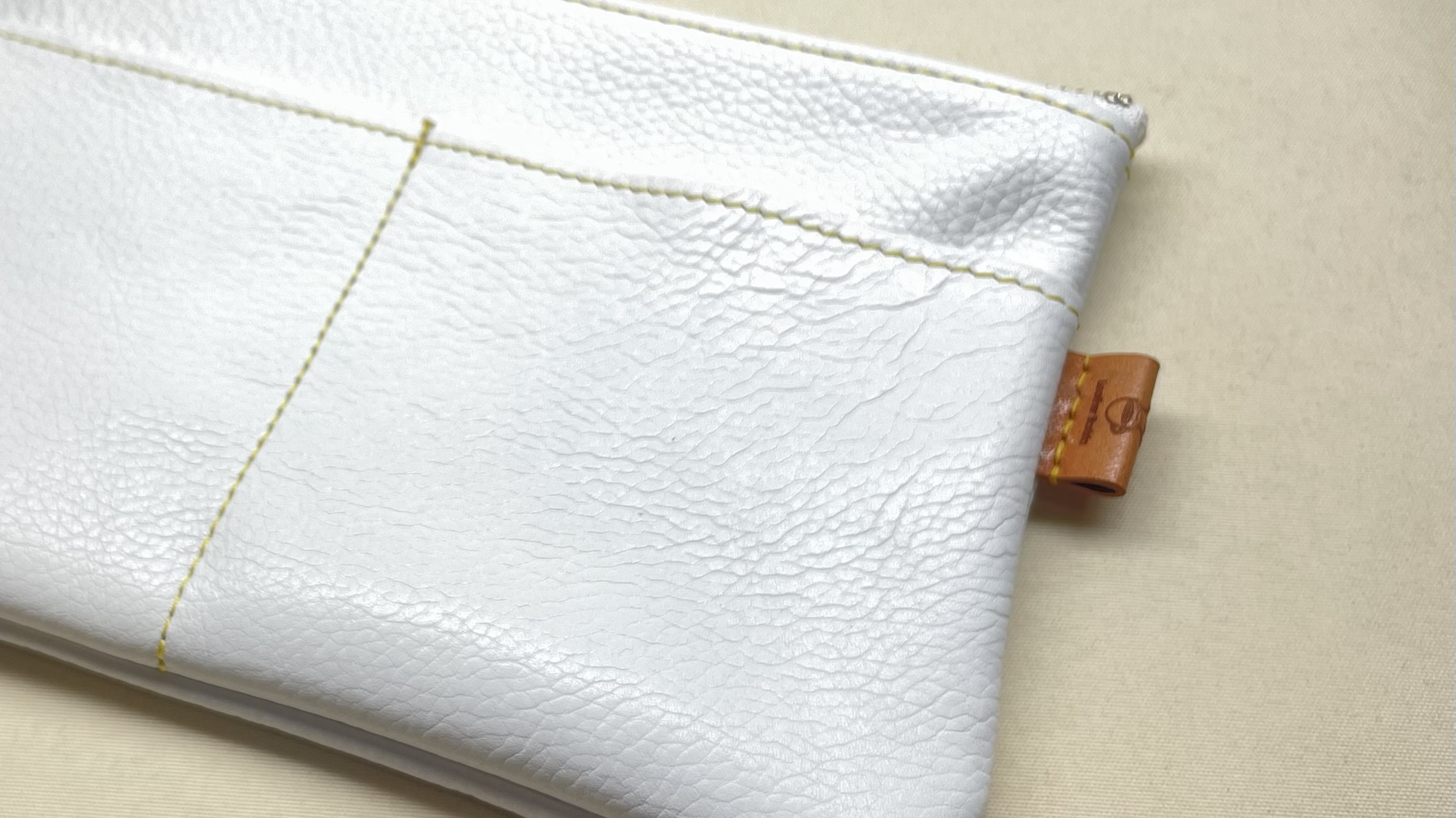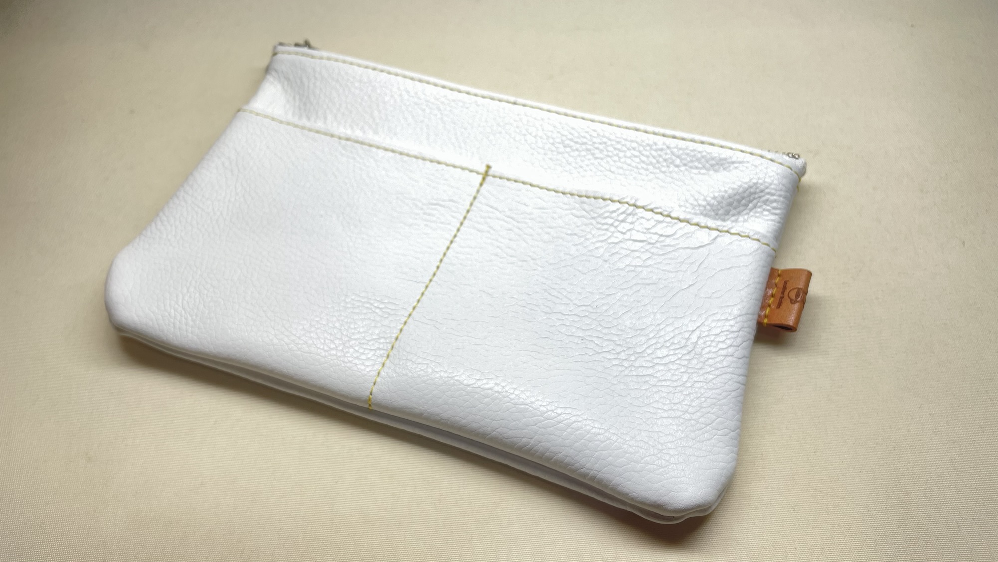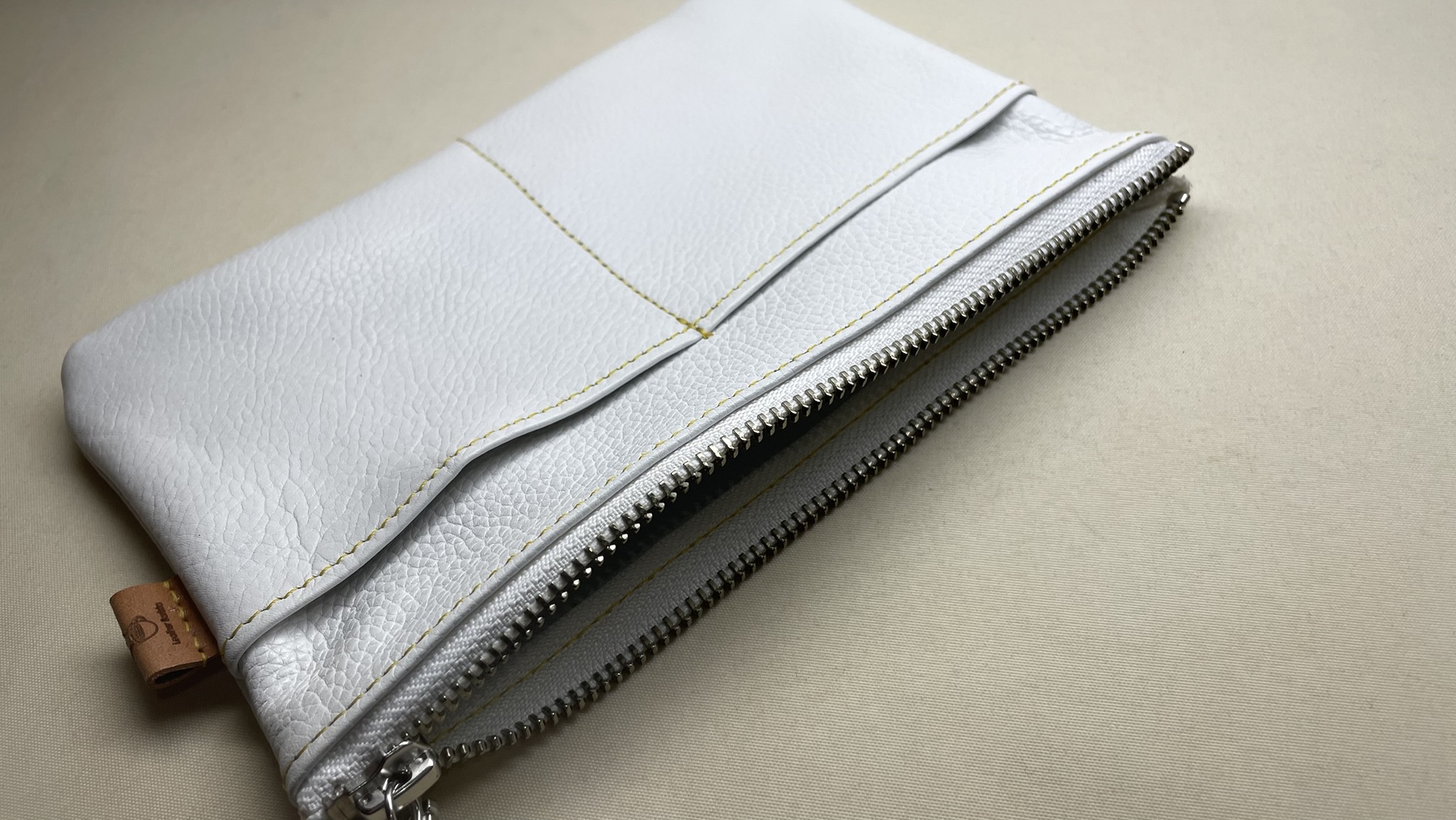 白色のファスナーポーチ 創作革小物/スマホケース 2025.05.20 白色で統一した平ポーチのご注文を頂きました 外側にも平ポケットをおつけしておりますので結構な収納力を実現しています マチなしなので薄い状態で持ち運びできる上、何かと便利なポーチです