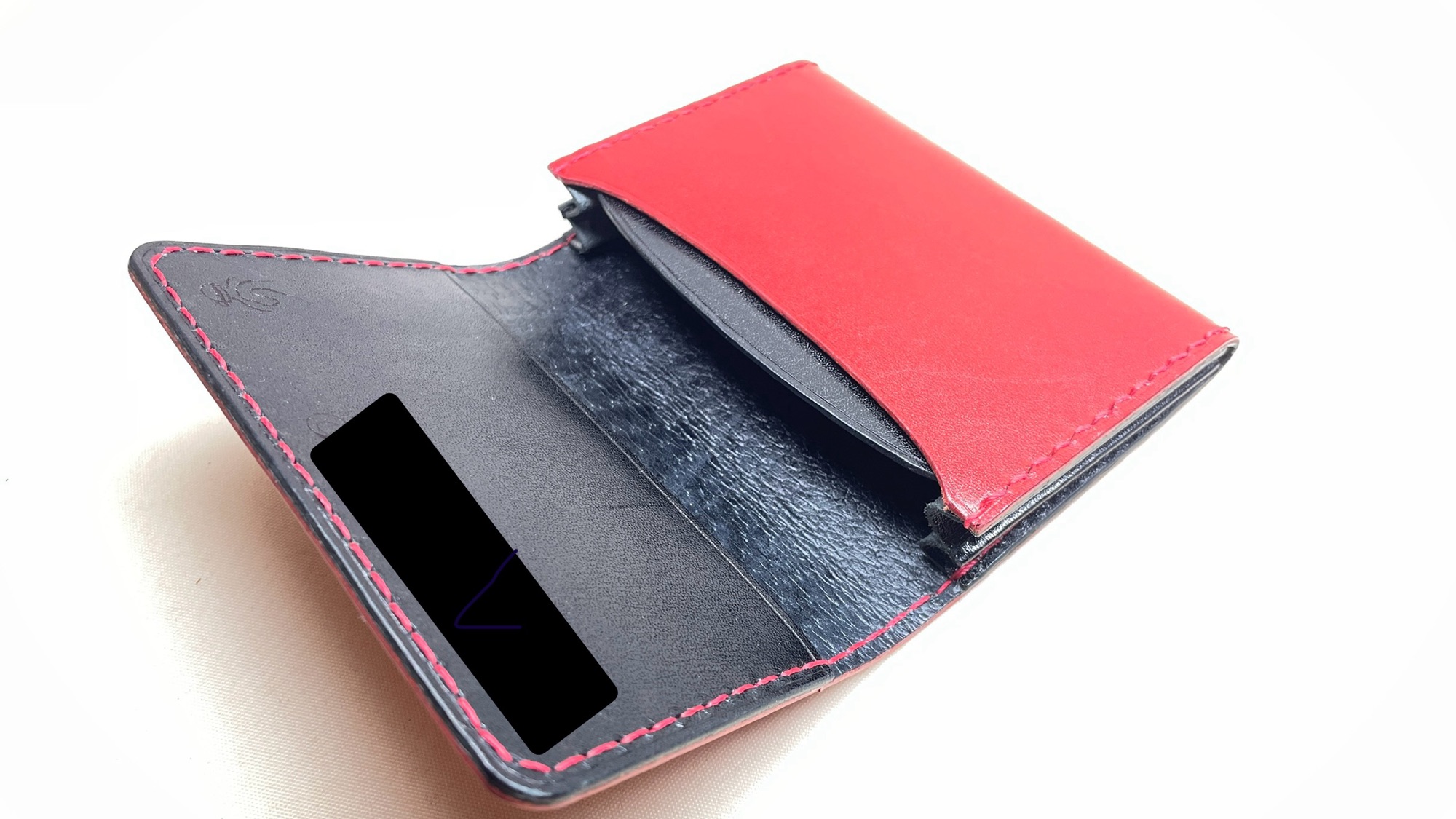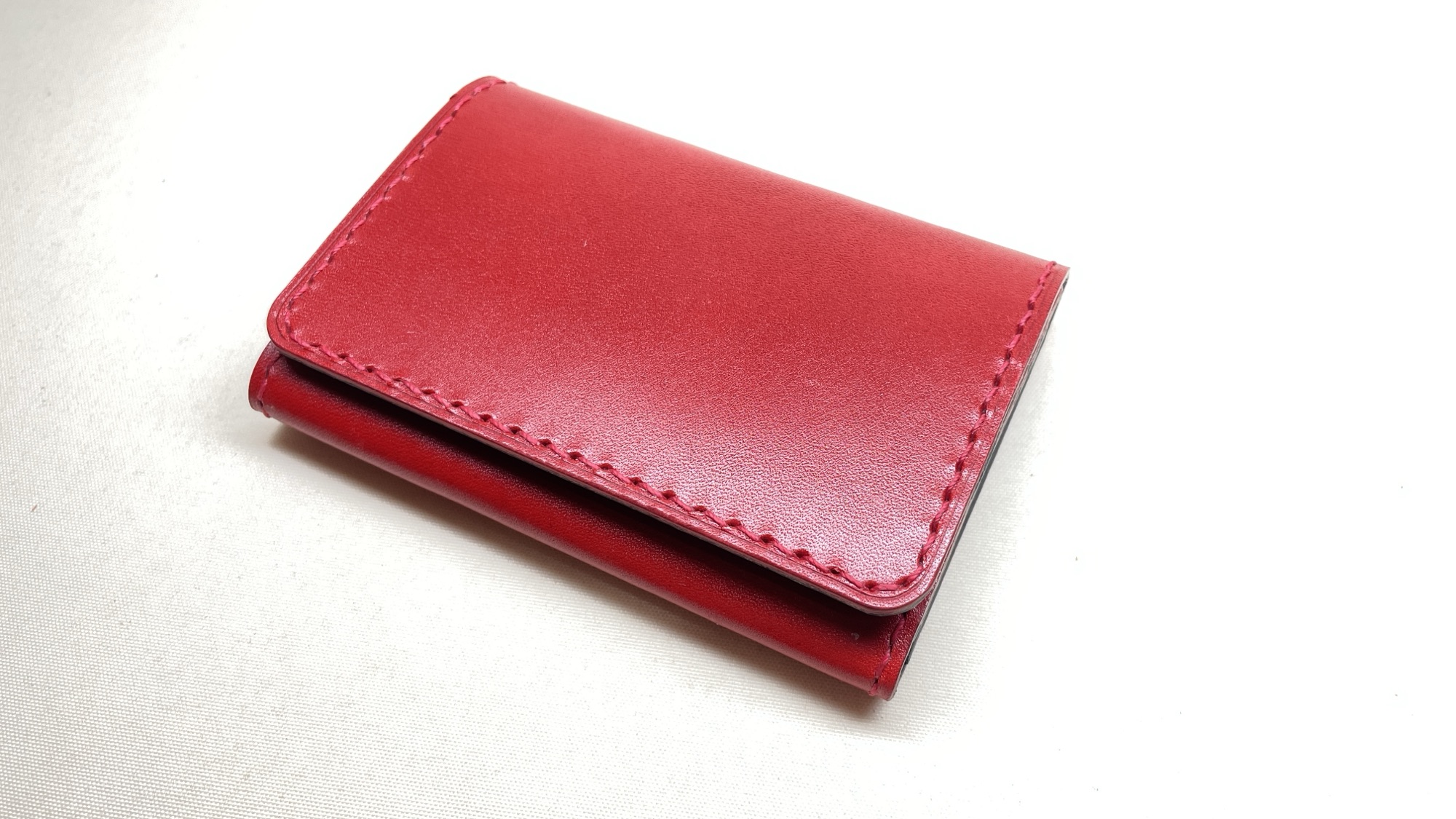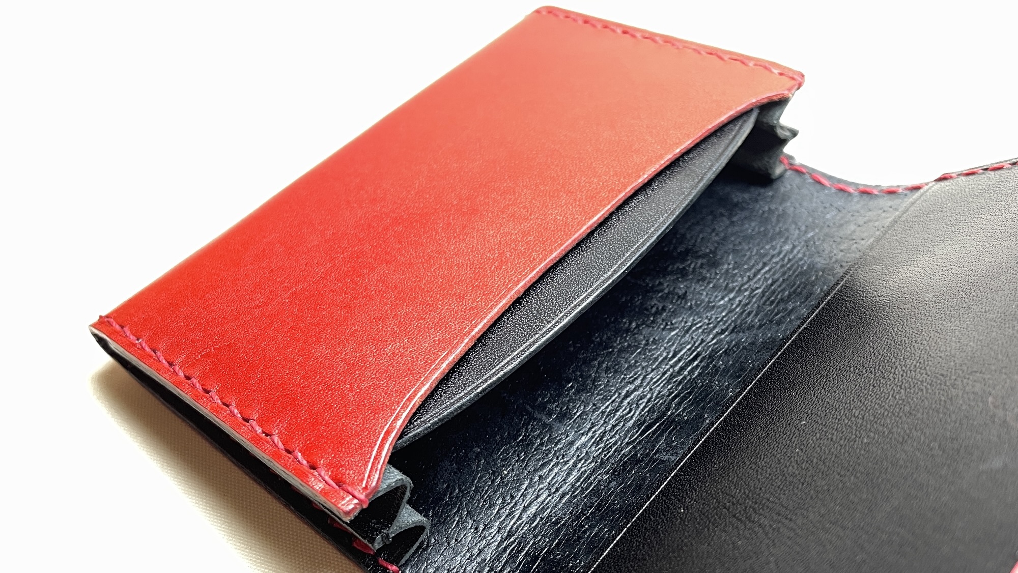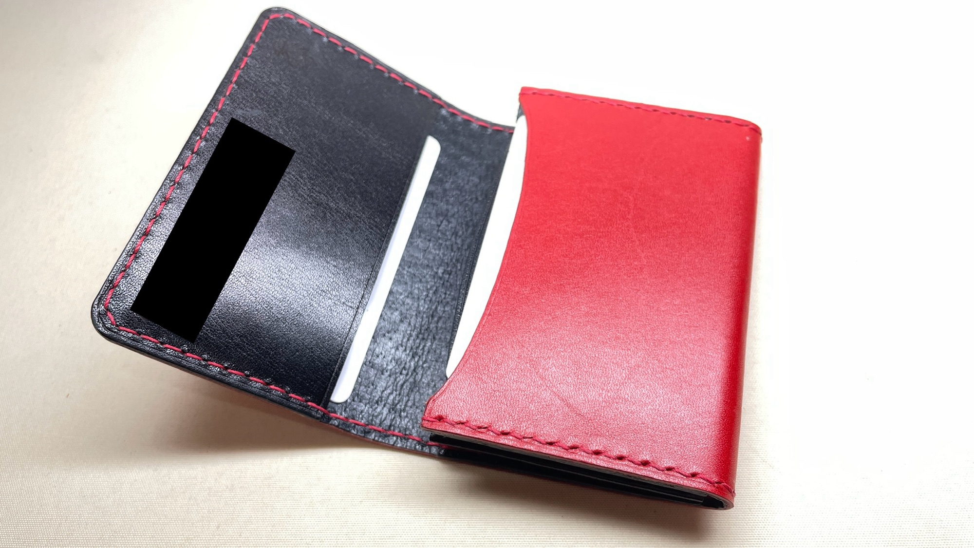 名刺ケース 創作革小物/スマホケース 2025.06.22 赤と黒の栃木レザー社のヌメ革を組み合わせた名刺ケースですシャープなデザインに色がマッチングして、とても高級感を出せてお作りできたと思いますツヤが少し強めな硬めのヌメ革ですのでインパクトも十分に仕上がりました