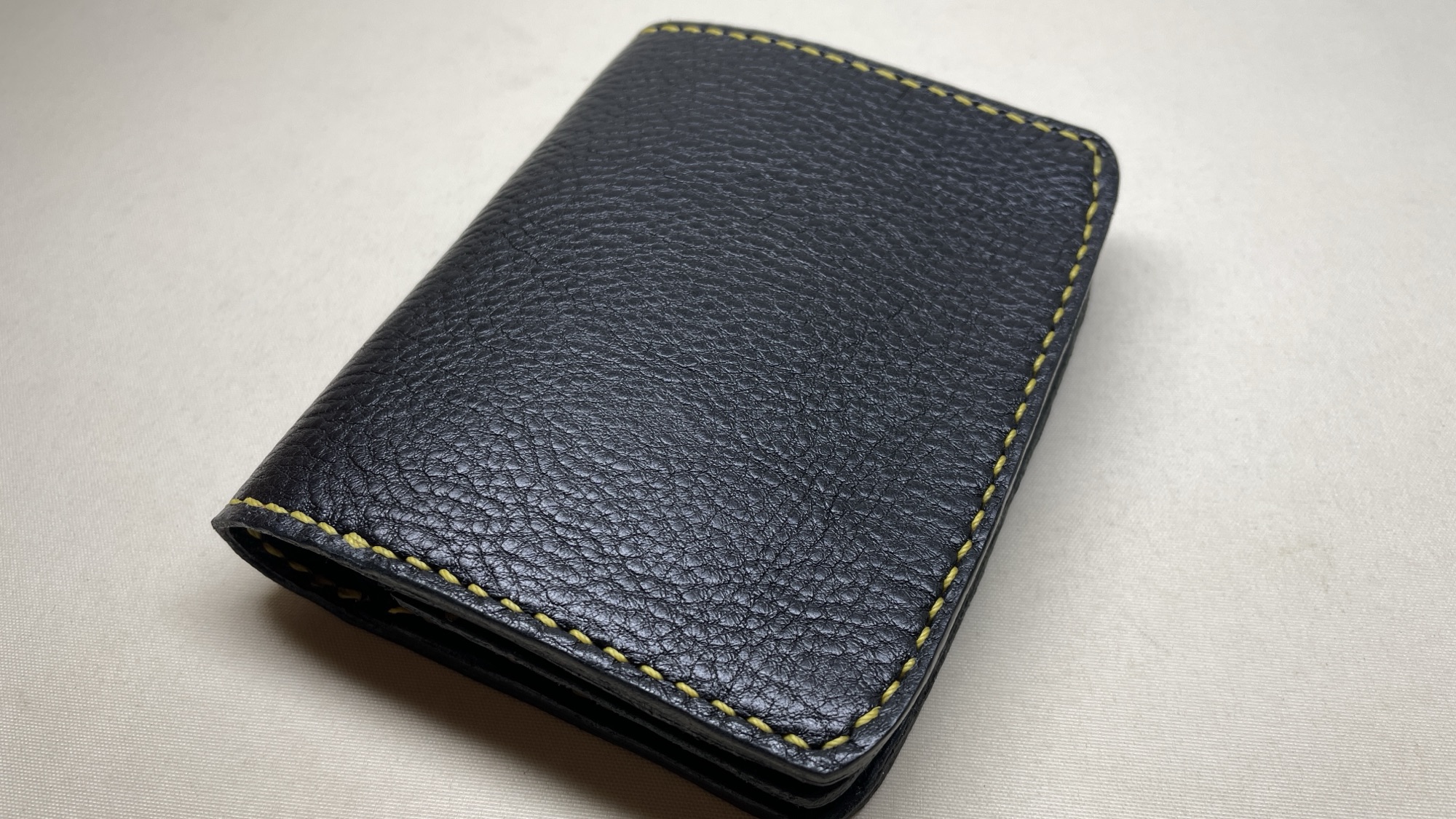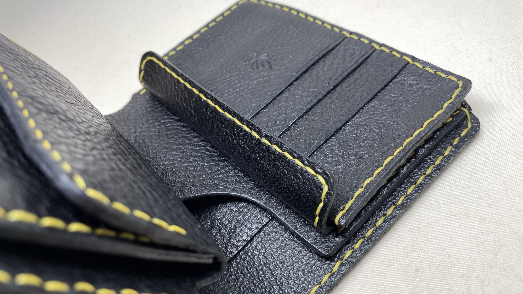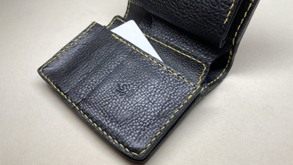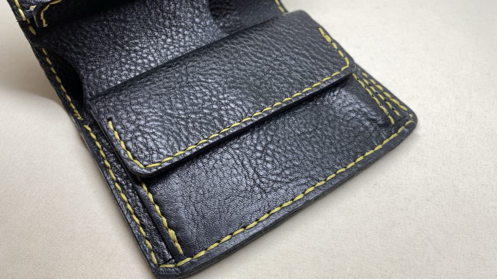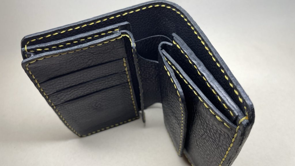 名刺幅の様に少し丈のある物でも収納ができ、お尻のポケットにも収まるミディアムサイズの二つ折りウォレットです。
