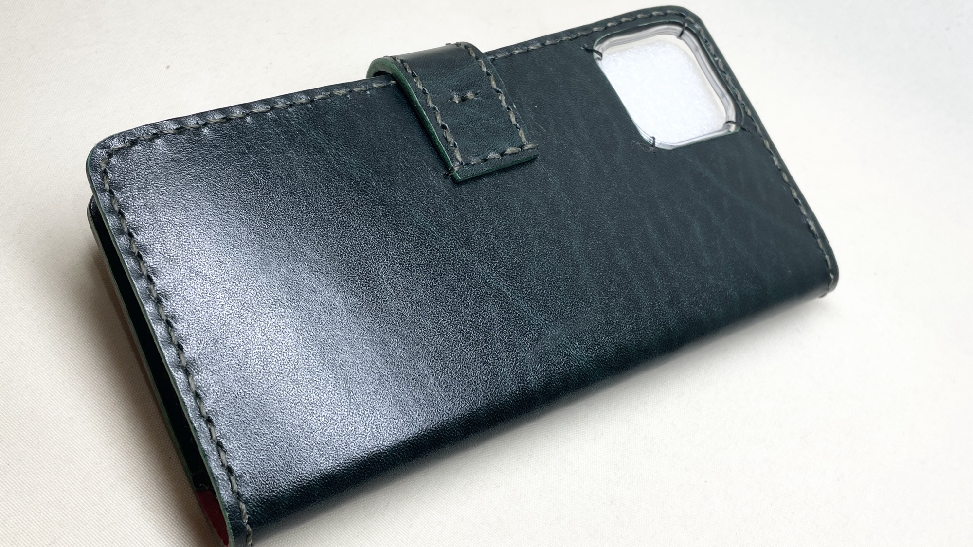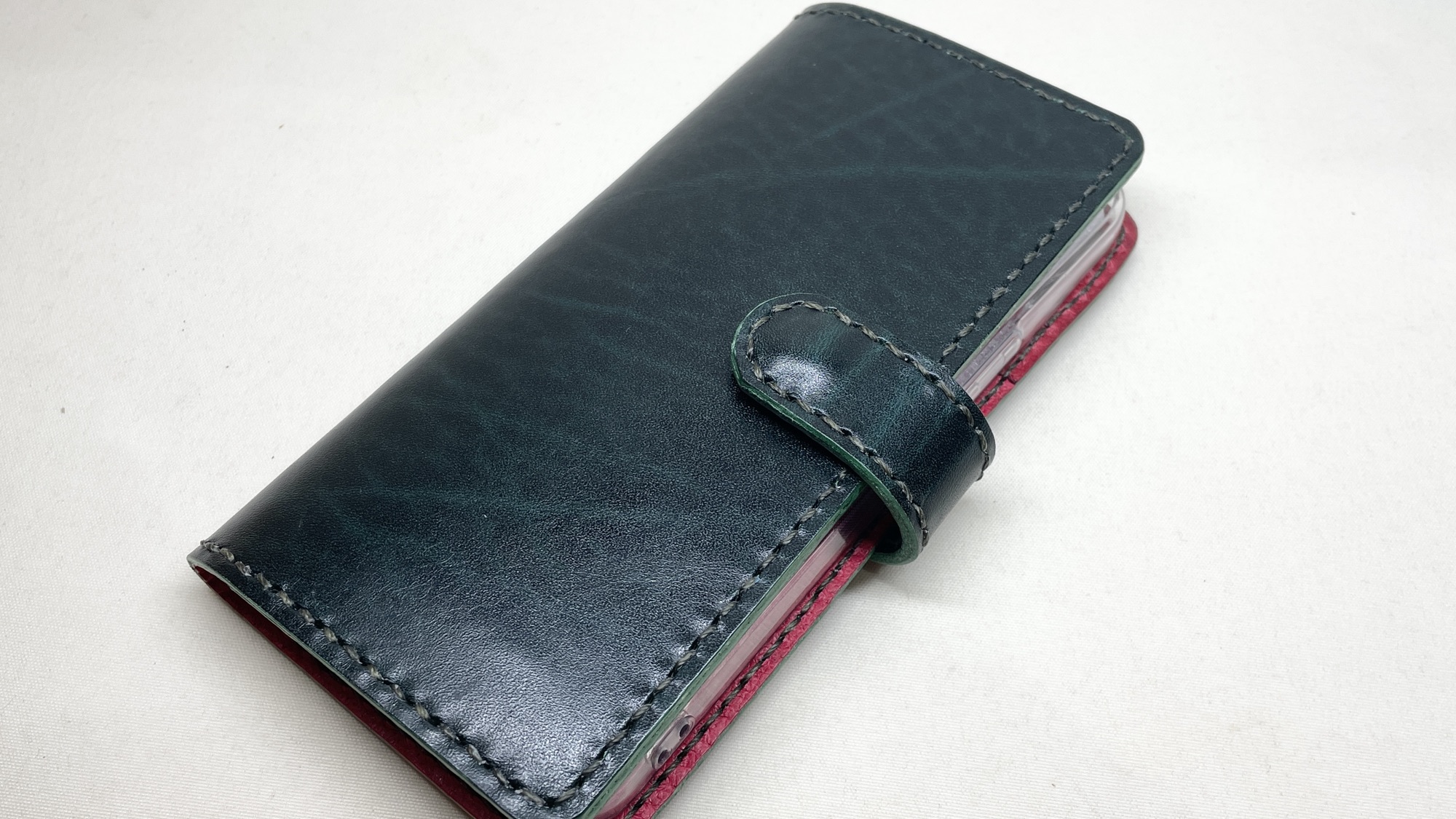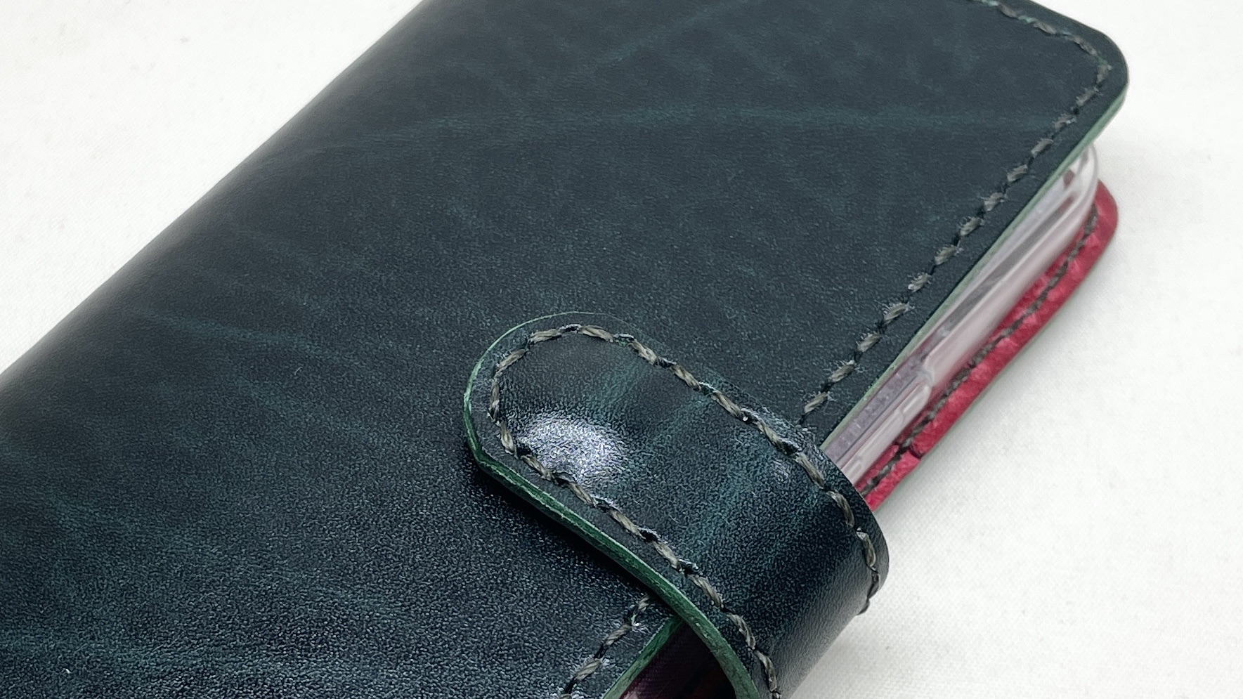 iPhone スマホケースです 創作革小物/スマホケース 2026.01.22 グリーンのルガトショルダーで作ったスマホケースです元から入っているシワとムラがそのまま表情になる革です 表情ありきで選ぶ革なので、均一じゃない所が1番綺麗この革は最初から完成してます
