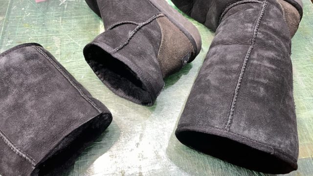 お客様のボア付きブーツの丈を半分以下に短くしました☺️長さをカットしてボアを短く刈り取り、ヘリを巻いて完成!比べてみるとよく分かります!1番左に写っているのはカットした部分です😆ミシンでできる事であれば割と何でもお直ししたりします!
