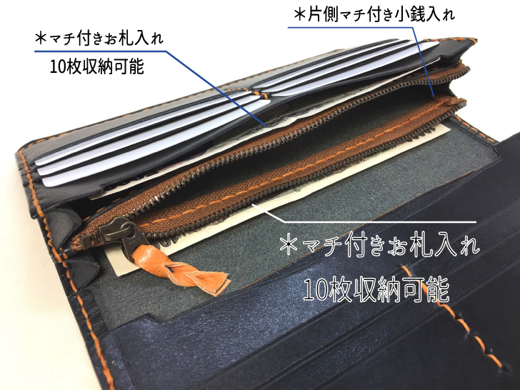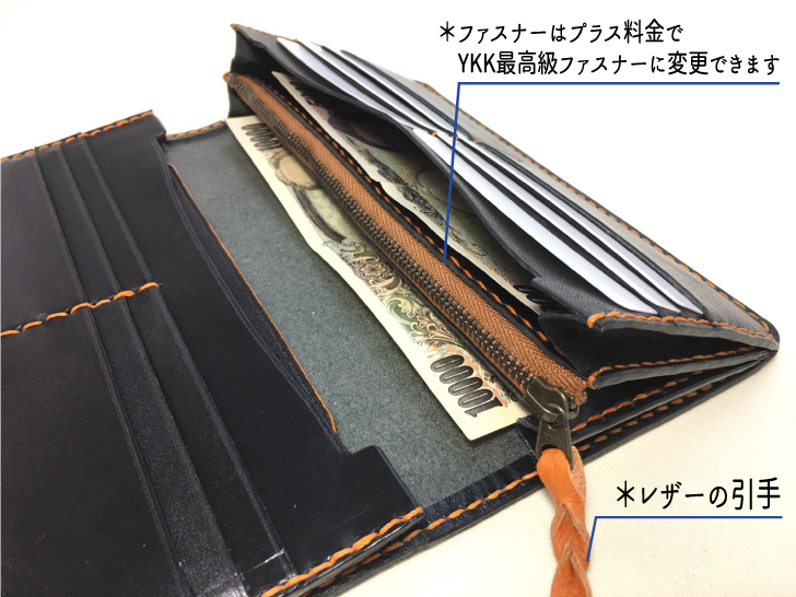 税込 31,900円 サイズ:10cm×19cm エレメントに入念な磨きをかけた滑らかなYKK高級ファスナーEXCELLAを使用しております 皮革とステッチの色はこちらより選択できます。(例えば「カードポケットの一部だけを赤色に」など、組み合わせは自由にご指定頂けます。) ネーム入れ、装飾などのオプションを組み合わせる事もできます。 デザインや仕様の一部を自由にオーダー変更もできます。お気軽にお申し付けください。