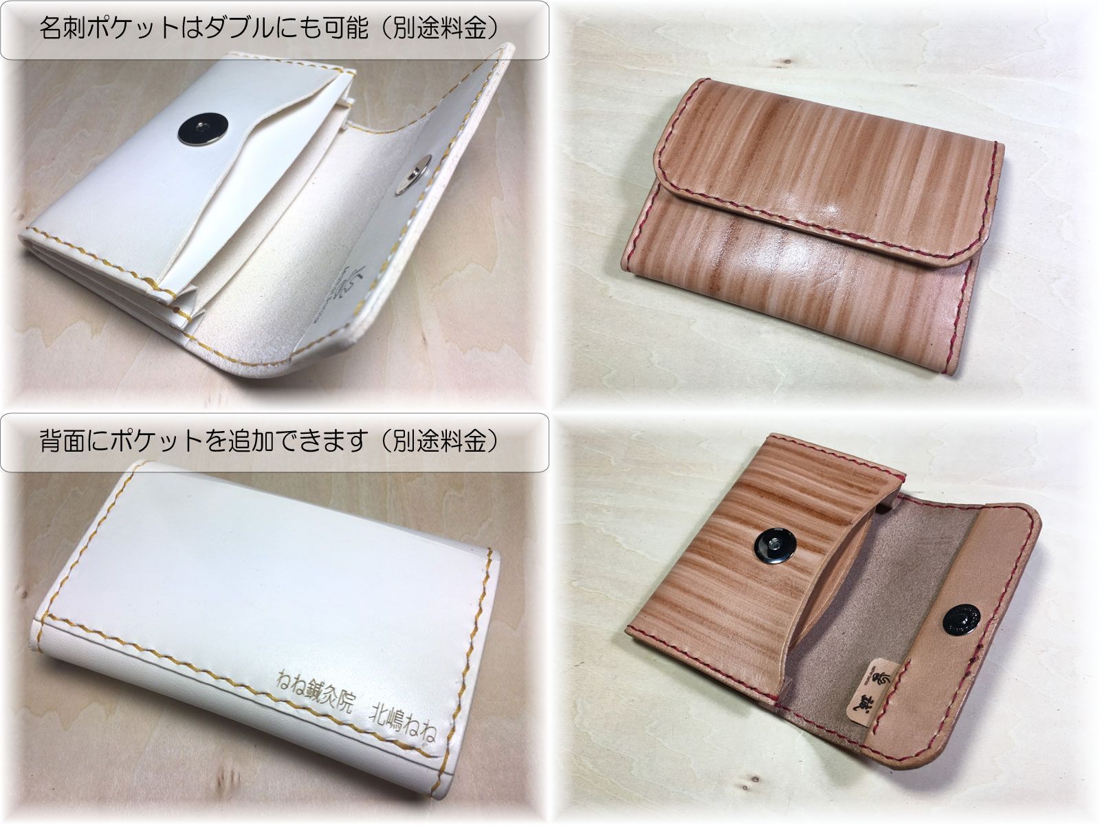 税込 11,000円 サイズ:10cm×9cm×2cm 皮革とステッチ:※こちらより選択できます。(例えば「カードポケットの一部だけを赤色に」など、組み合わせは自由にご指定頂けます。) ※色の組み合わせイメージ画像をお見せできますのでお申し付け下さい。 コンチョやスタッズ、ネームやイラスト入れなど様々なオプションを組み合わせたり、デザインや仕様の一部を自由にオーダー変更もできます。お気軽にお申し付けください。