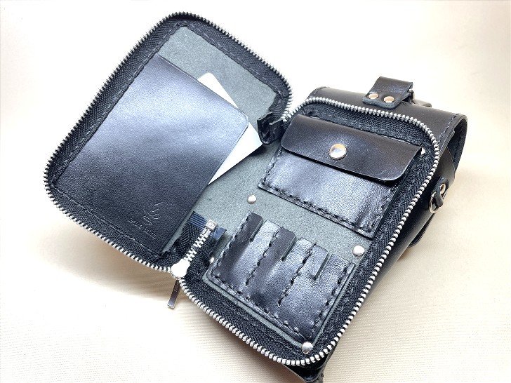 税込 32,600円 サイズ:20cm×11.5cm 手縫いとミシン縫いで仕上げます 皮革とステッチの色はこちらより選択できます。(例えば「カードポケットの一部だけを赤色に」など、組み合わせは自由にご指定頂けます。) ネーム入れ、装飾などのオプションを組み合わせる事もできます。 デザインや仕様の一部を自由にオーダー変更もできます。お気軽にお申し付けください。