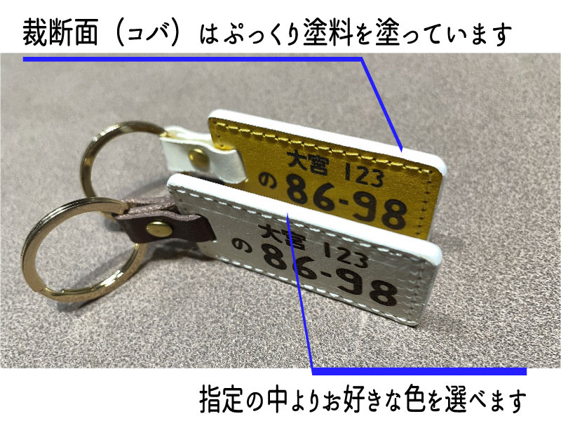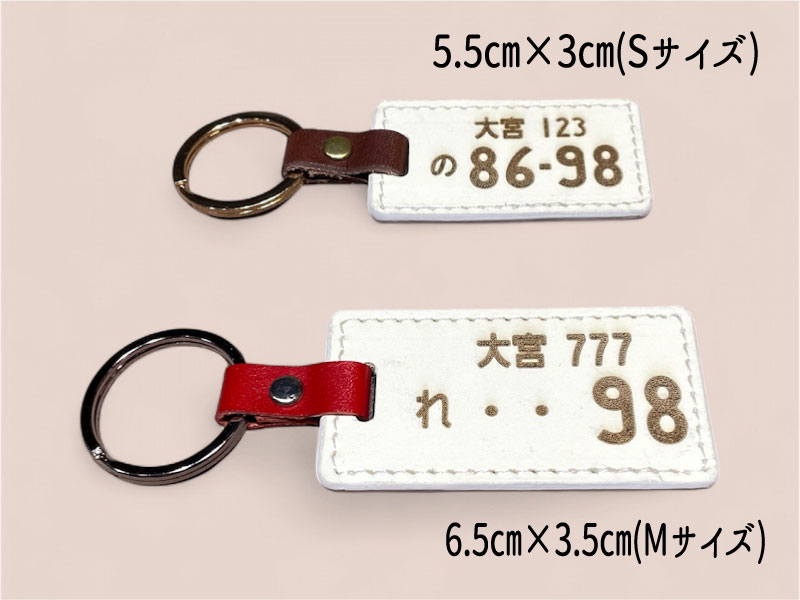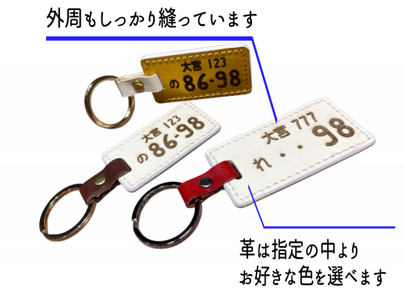 Sサイズ:税込 3,200円 Mサイズ:税込 3,700円 プレートサイズ:6.5㎝×3.5㎝(Mサイズ)、5.5㎝×3㎝(Sサイズ) ※キーホルダーのベースの色、金具連結部分の色は要望に近い色をご用意できます。 ※文字部分はレーザーにて焼き加工しますので文字は黒色になります。 皮革とステッチ:※こちらより選択できます。(例えば「カードポケットの一部だけを赤色に」など、組み合わせは自由にご指定頂けます。)